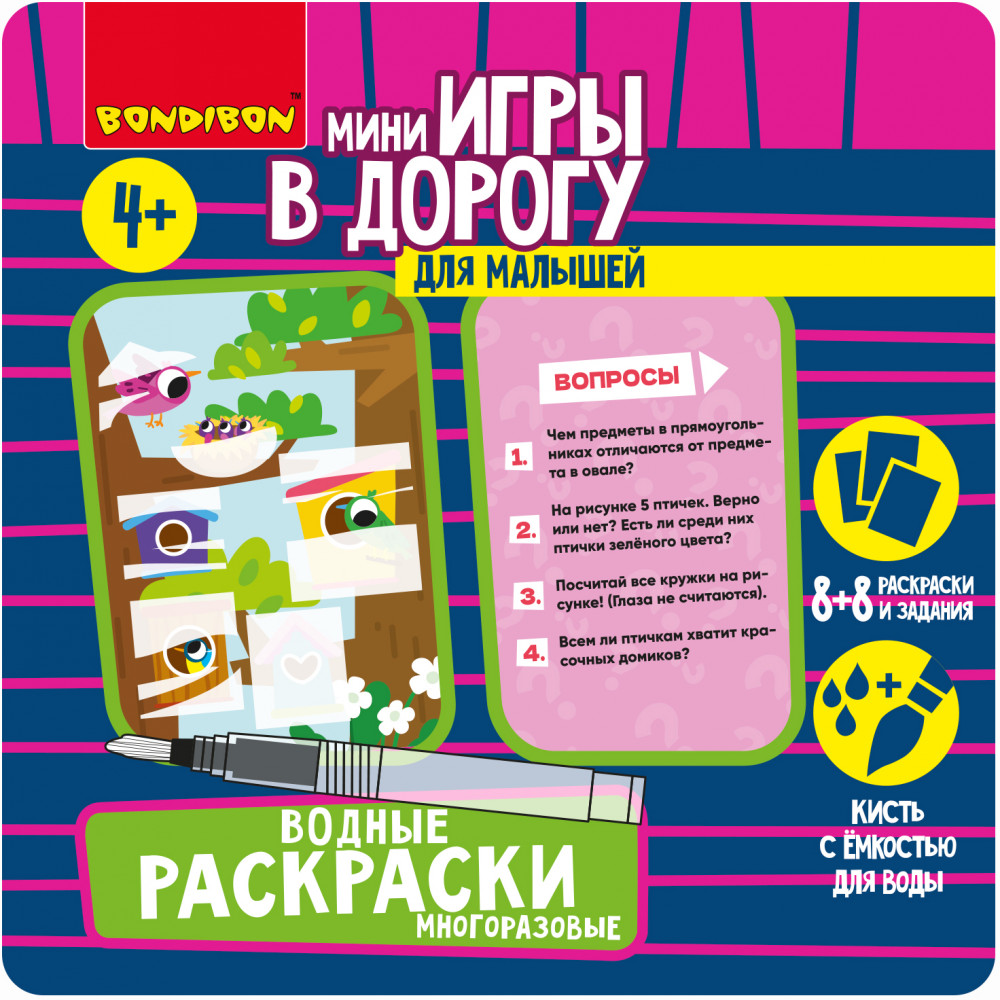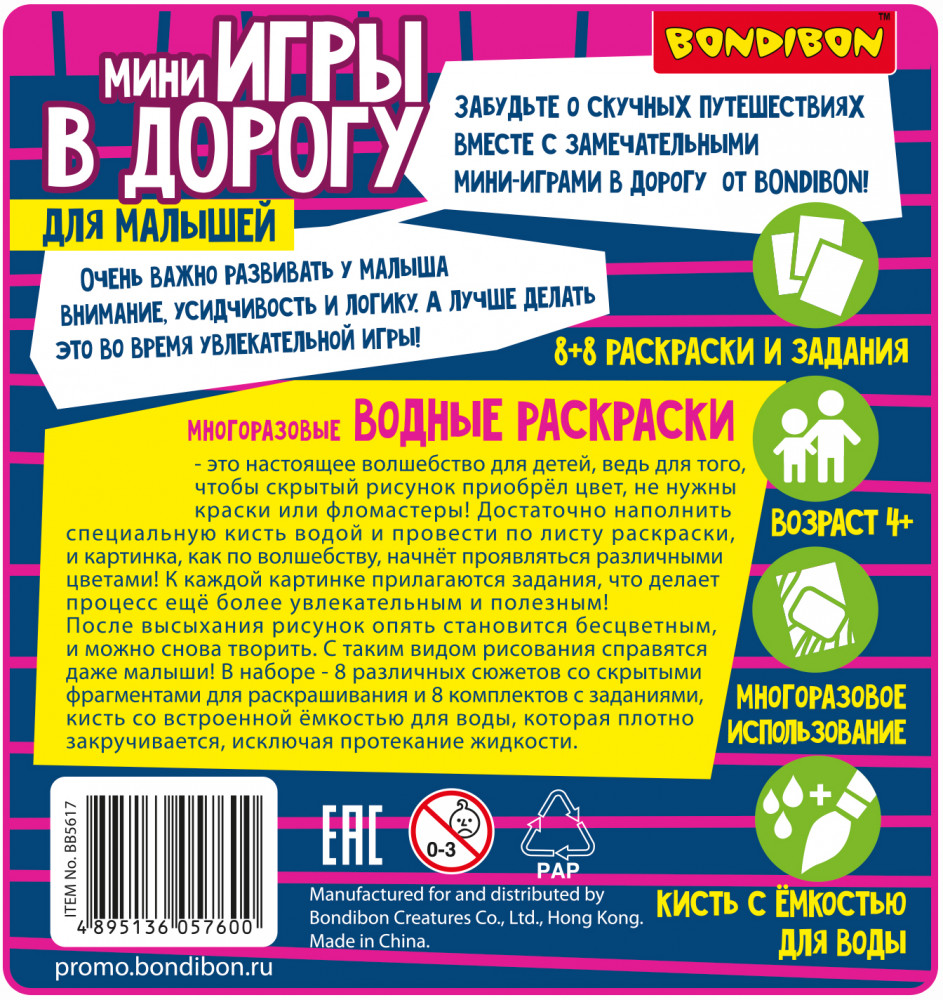 💳 Оплатить за товар можно при получении 🇰🇿 Есть бесплатная доставка по Казахстану от 1 дня 🎁 Копите бонусы с каждой покупки Серия: Мини-игры в дорогу Просто добавь воды! Многоразовые водные раскраски от «Bondibon» — это замечательный тренажер для обучения маленького ребенка рисованию и раскрашиванию. Такие игры активно развивают моторику у малышей и способствуют подготовке детской руки к письму. А еще это настоящее волшебство! Достаточно наполнить специальную кисть водой и провести по листу раскраски, и картинка начнет проявляться различными цветами! При раскрашивании не происходит смешивания цветов с разных участков изображения, поэтому независимо от навыка рисования, рисунок получается аккуратный. |