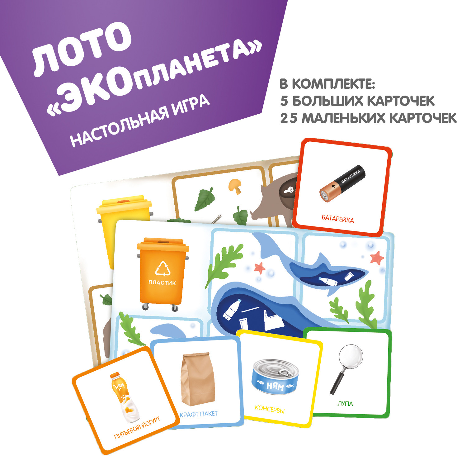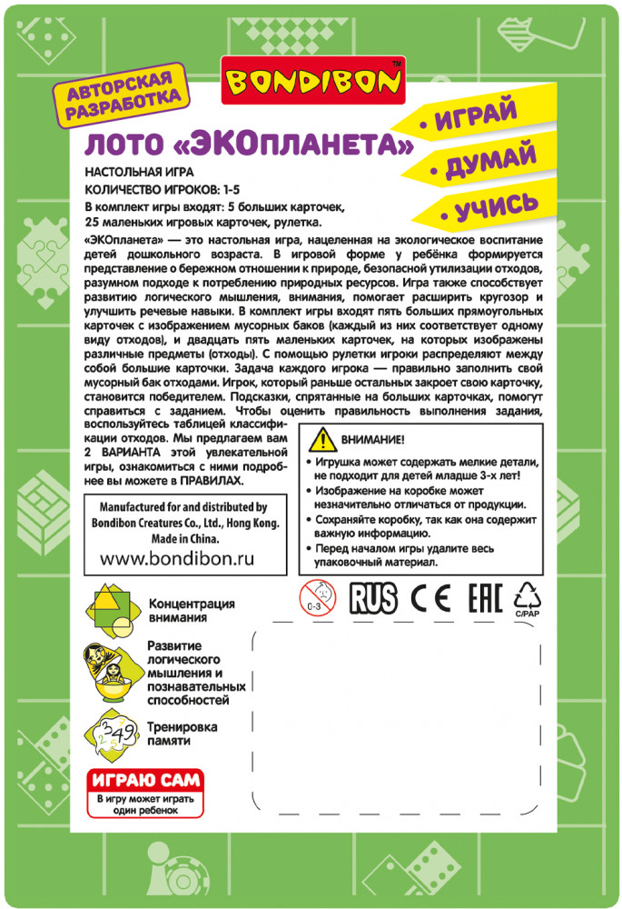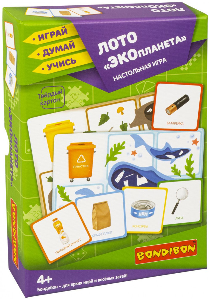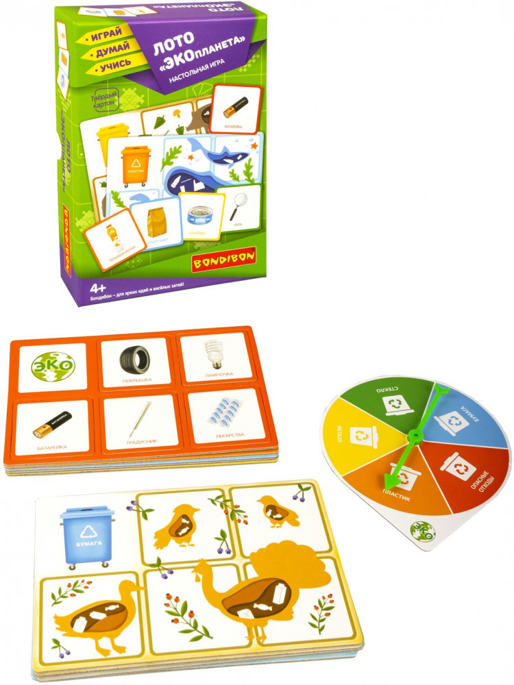 Серия: Играй. Думай. Учись Хотите правильного отношения ребенка к окружающей его природе? Тогда подарите ему настольную игру лото «Экопланета» 2 в 1 от «Bondibon». Игра серии «Играй Думай Учись» учит одному из важных принципов экологического образа жизни — сортировке мусорных отходов. Помимо воспитательных моментов игра развивает логическое мышление, концентрацию внимания и память. С помощью рулетки Вы распределяете между игроками большие карточки и заполняете свой мусорный бак отходами — маленькими карточками с мусором. Побеждает тот, кто первый закроет свою карточку. Концепция экологического образа жизни наиболее эффективно прививается в детстве — в игровой форме будет закладываться представление о бережном отношении к природе и разумном подходе к потреблению природных ресурсов. |
