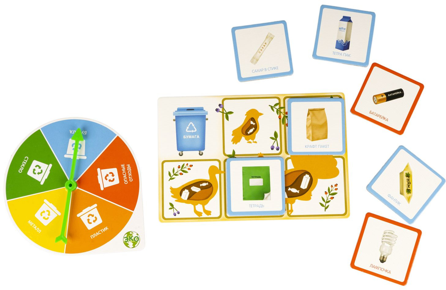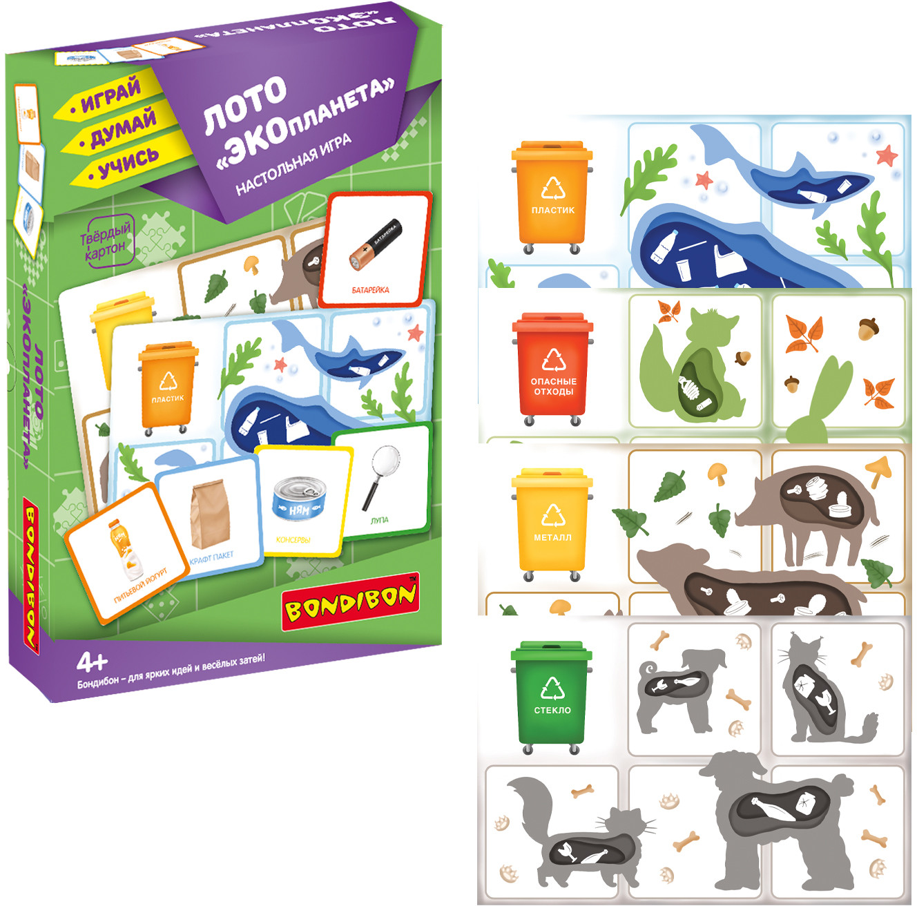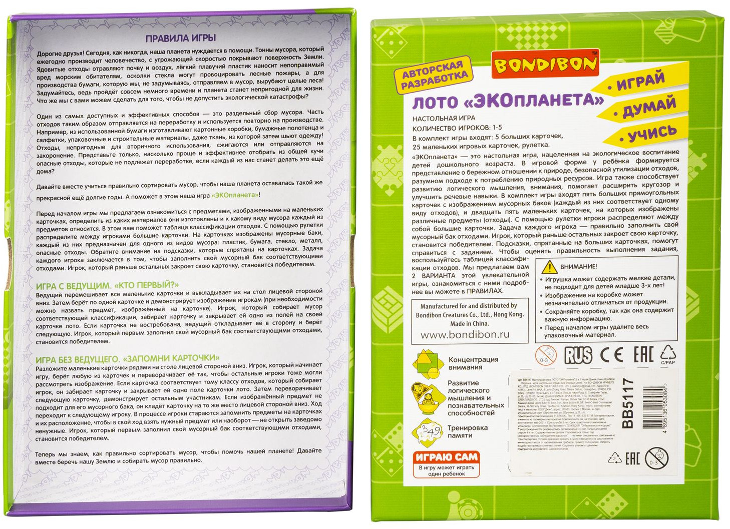 Серия: Играй. Думай. Учись Хотите правильного отношения ребенка к окружающей его природе? Тогда подарите ему настольную игру лото «Экопланета» 2 в 1 от «Bondibon». Игра серии «Играй Думай Учись» учит одному из важных принципов экологического образа жизни — сортировке мусорных отходов. Помимо воспитательных моментов игра развивает логическое мышление, концентрацию внимания и память. С помощью рулетки Вы распределяете между игроками большие карточки и заполняете свой мусорный бак отходами — маленькими карточками с мусором. Побеждает тот, кто первый закроет свою карточку. Концепция экологического образа жизни наиболее эффективно прививается в детстве — в игровой форме будет закладываться представление о бережном отношении к природе и разумном подходе к потреблению природных ресурсов. |