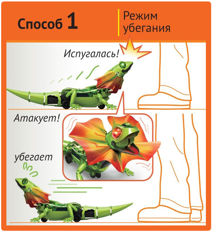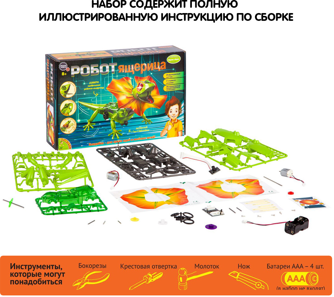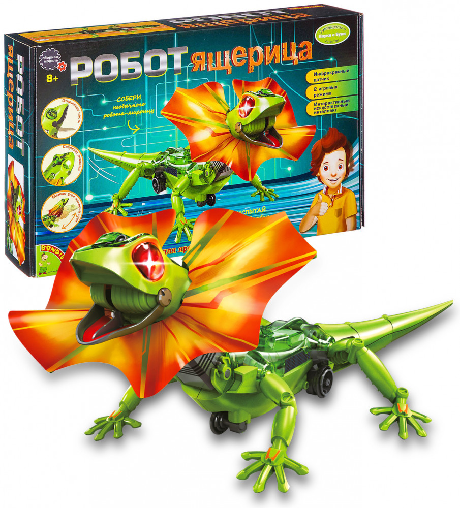 Серия: Науки с Буки. Французские опыты Познакомься с миром роботов, узнай, как они работают. Собери робота-ящерицу. У этого робота есть инфракрасный датчик, который запрограммирован на два режима: убегание или преследование. Если датчик активирован на режим убегания, робот автоматически будет реагировать и пугаться, расправляя свой воротник, открывая пасть, сверкая глазами с двухцветными светодиодами, и будет удирать от тебя, пока не отбежит на безопасное расстояние. А если перевести ящерицу в режим преследование, робот будет оценивать опасность, пытаясь запугать противника, раскрывая свой воротник и встряхивая им. Когда робот не чувствует опасность, он будет бегать за тобой, как обычная домашняя зверушка. Игра с этим набором поможет приобрести новые знания в области физики и механики, или закрепить ранее полученные в школе. В наборе все детали для сборки робота. |