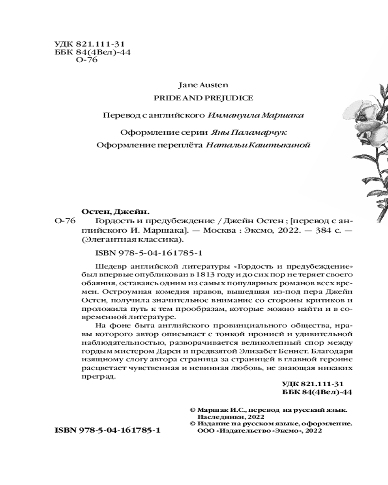 💳 Оплатить за товар можно при получении 🇰🇿 Есть бесплатная доставка по Казахстану от 1 дня 🎁 Копите бонусы с каждой покупки Серия: Элегантная классика Шедевр английской литературы «Гордость и предубеждение» был впервые опубликован в 1813 году и до сих пор не теряет своего обаяния, оставаясь одним из самых популярных романов всех времен. Остроумная комедия нравов, вышедшая из-под пера Джейн Остен, получила значительное внимание со стороны критиков и проложила путь к тем прообразам, которые можно найти и в современной литературе. |
