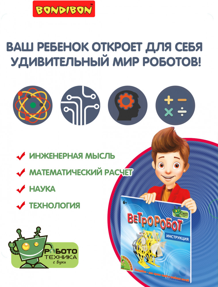 Bondibon Набор для опытов «Ветроробот»В данный момент этот товар отсутствует в продаже. Возможно, у нас найдется аналогичный или похожий товар здесь. Серия: Робототехника с Буки Следуя подробной инструкции, ребенок самостоятельно соберет модель забавного ветряного робота. Он сможет прийти в движение двумя способами: используя природную силу ветра или при помощи электродвигателя и несложной системы передач. Его можно брать с собой на природу или играть дома. В наборе вы найдёте всё необходимое детали робота, отвёртку и подробную инструкцию. |