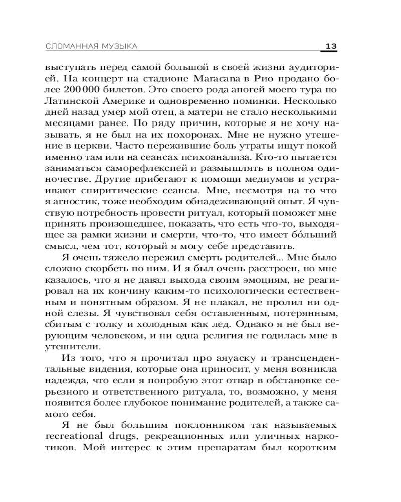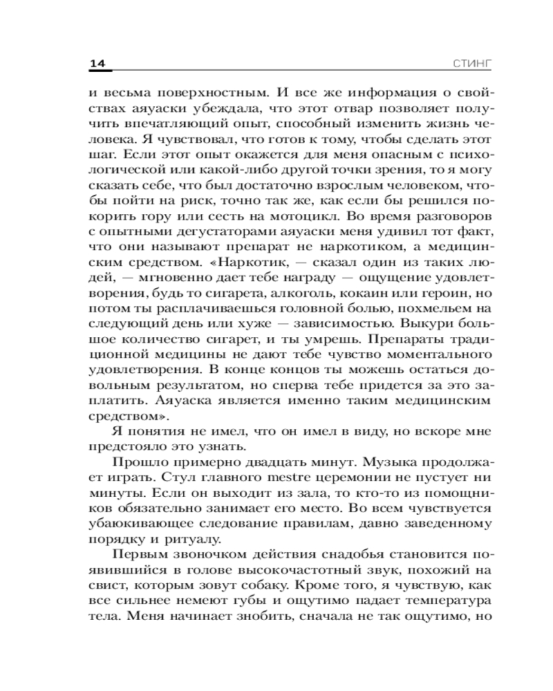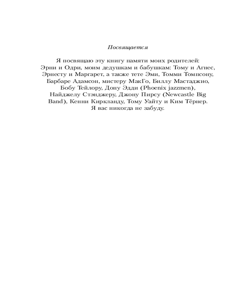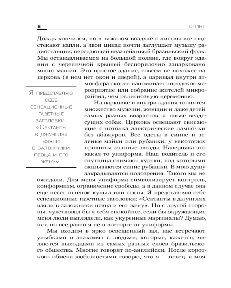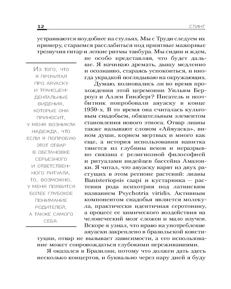 Его мемуары рассказывают о детстве в захолустном городке, где он впервые влюбился в музыку, о том, как была создана группа The Police и как она распалась, о первых песнях, о дорогих ему людях и событиях, повлиявших на все творчество Стинга, и, конечно, о признании и предназначении. Он отправляет читателя в затягивающее путешествие по Ньюкаслу 50-х, 60-х и 70-х годов, рассказывая закулисную жизнь британского шоу-бизнеса. Проникновенная история от первого лица, позволяющая увидеть, почему песни Стинга столь мистичны и поучительны, и понять, кто же такой Гордон Самнер на самом деле. |