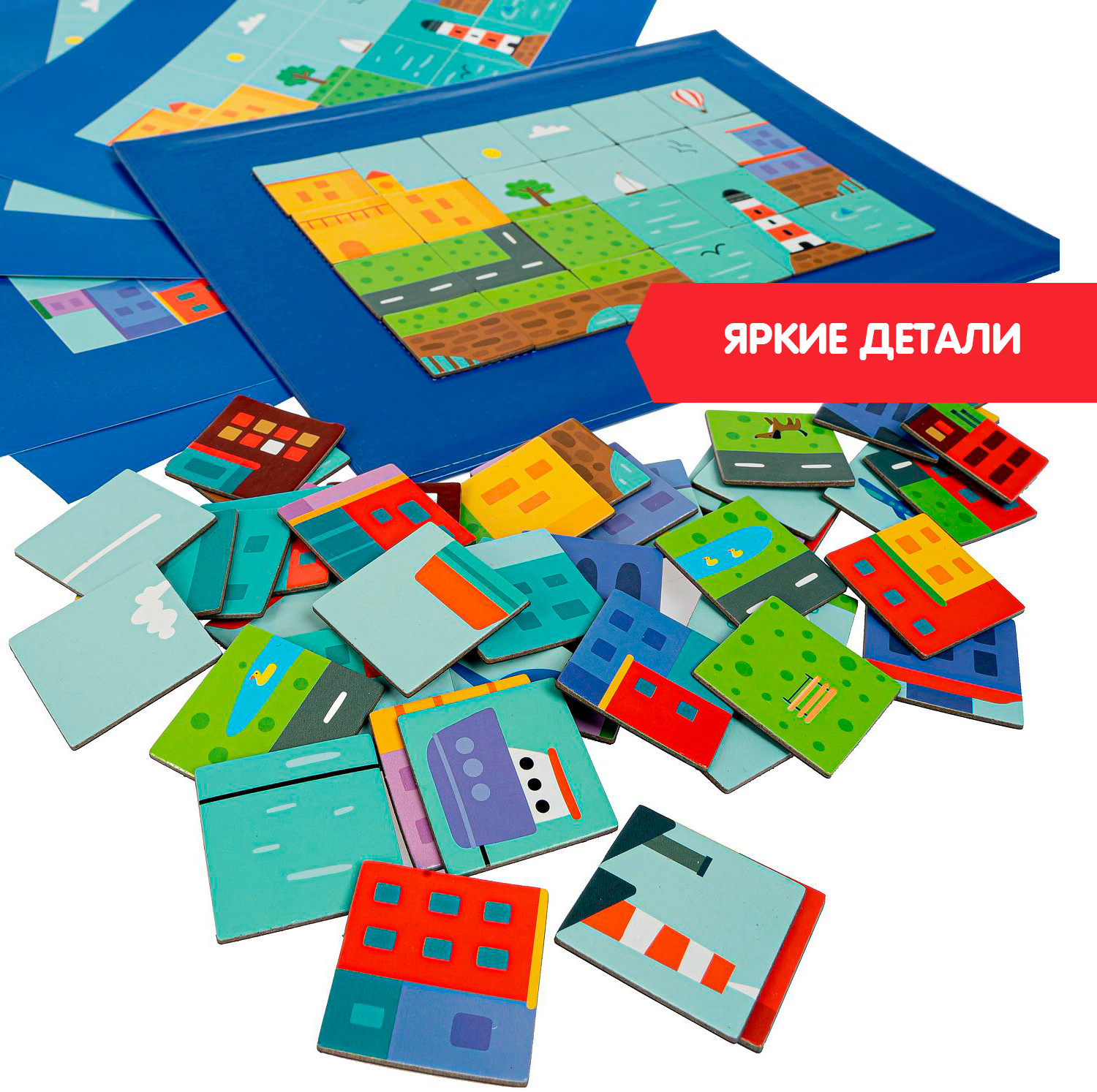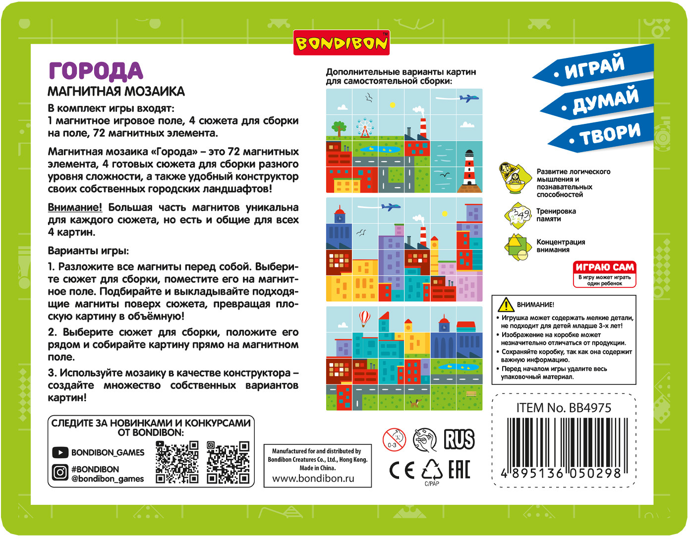 Магнитная мозаика «Города» 4 в 1 серии «Играй Думай Твори» от Bondibon — это 72 магнитных элемента, 4 готовых сюжета для сборки разного уровня сложности, а также удобный конструктор своих собственных городских ландшафтов! Большая часть магнитов уникальна для каждого сюжета, но есть и общие для всех четырех картин. Игра удобна в дороге, долговечна, отлично тренирует внимательность и развивает фантазию и пространственное мышление.
