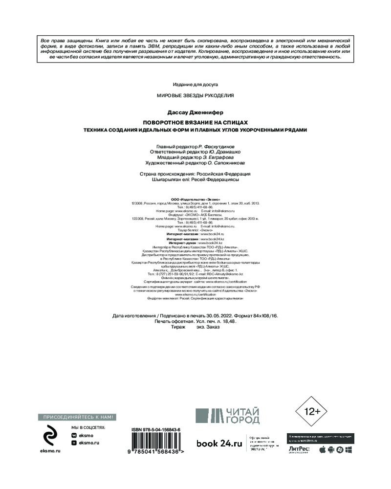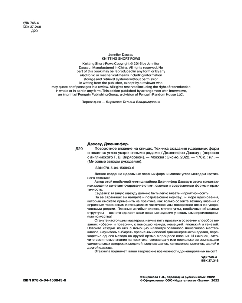 Поворотное вязание на спицах. Техника создания идеальных форм и плавных углов укороченными рядамиВ данный момент этот товар отсутствует в продаже. Возможно, у нас найдется аналогичный или похожий товар здесь. Серия: Мировые звезды рукоделия Самое простое, понятное и практичное пособие по технике вязания укороченными рядами, или поворотному вязанию. Эта по-настоящему волшебная техника позволяет не только аккуратно, быстро и эргономично вывязывать технологические детали вязаной одежды, такие как росток, фигурная планка и .п., но и создавать невероятные варианты дизайна, которые поднимут уровень ваших изделий на недостижимую высоту! Теперь вам под силу создать любой скругленный край или плавный угол! Пять простых в освоении способов вязания: «оберни и поверни», с помощью накида, немецкий, японский и теневой, автор книги объясняет не только в пошаговых иллюстрированных инструкциях, но и на примере красивых авторских проектов шапок, джемперов и т.п. Идеальная книга, чтобы прокачать свое вязальное мастерство и выйти на новый профессиональный уровень! |