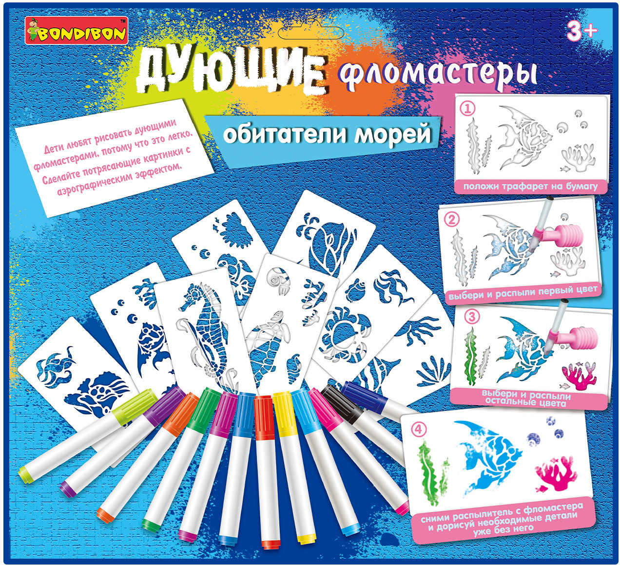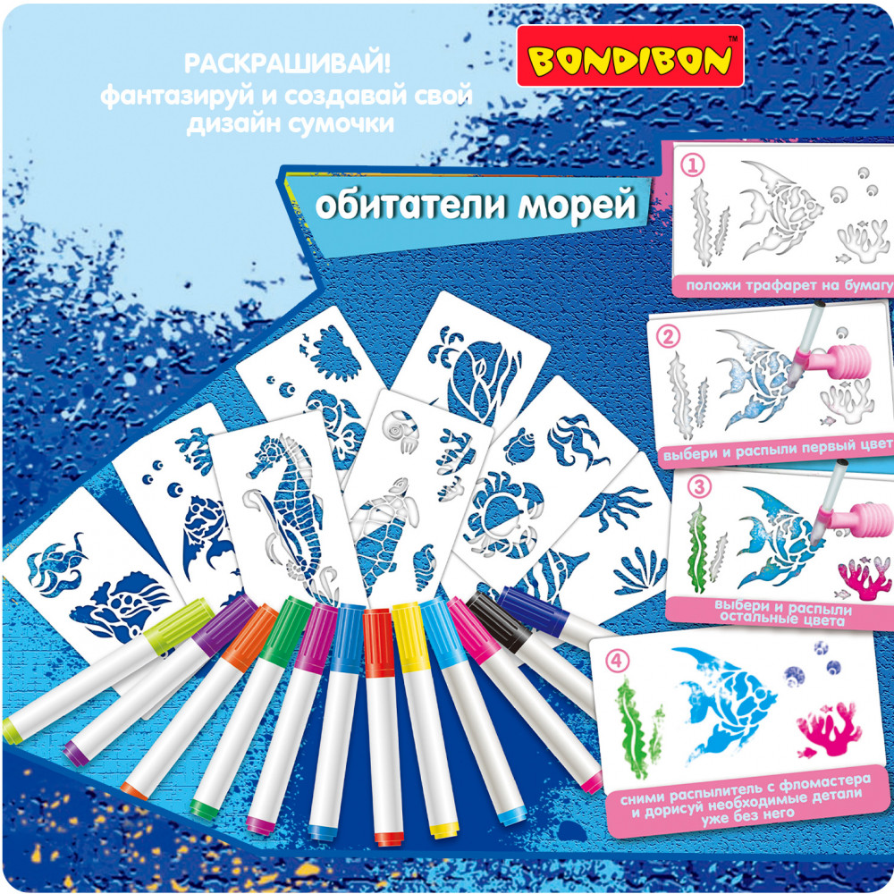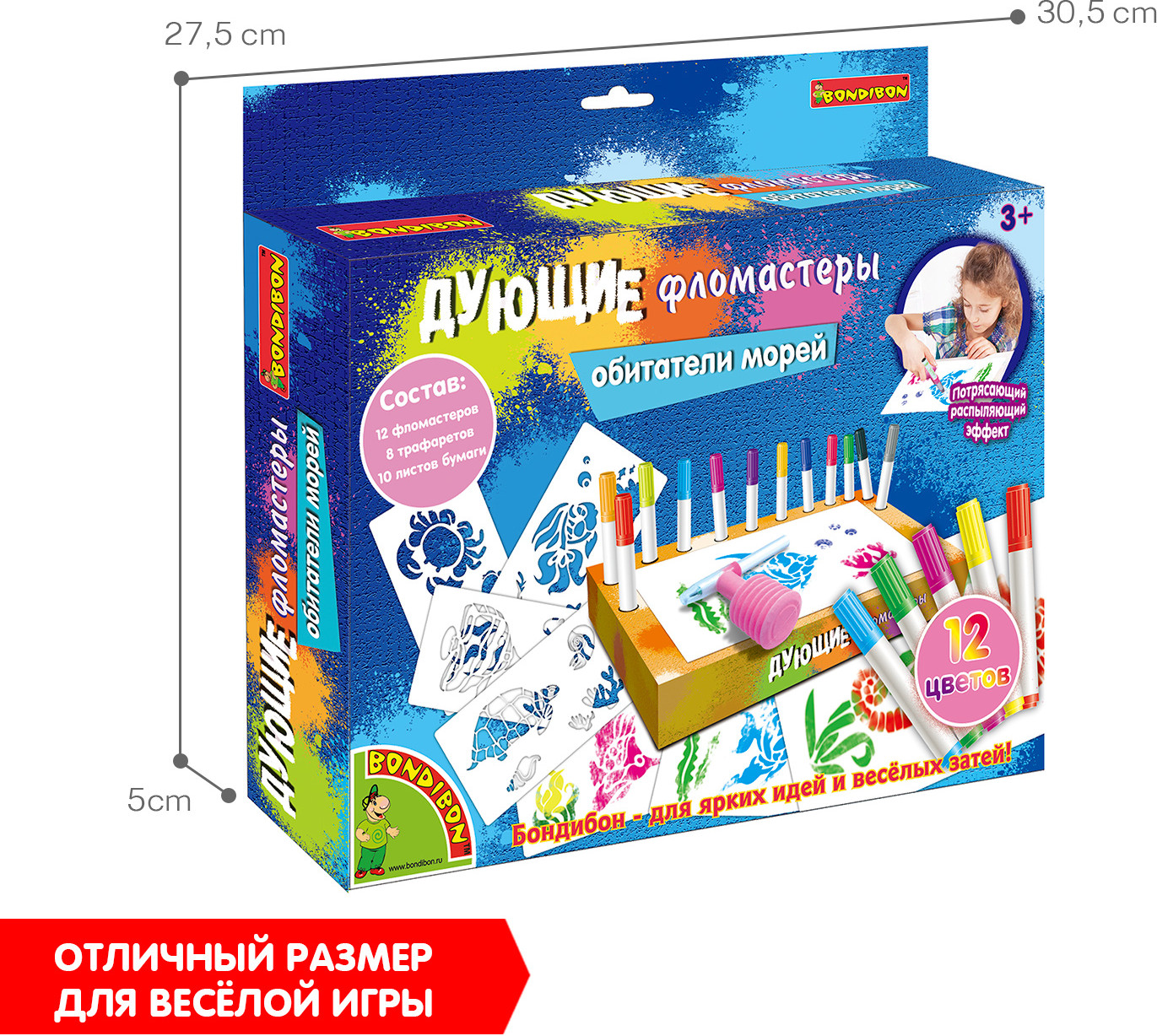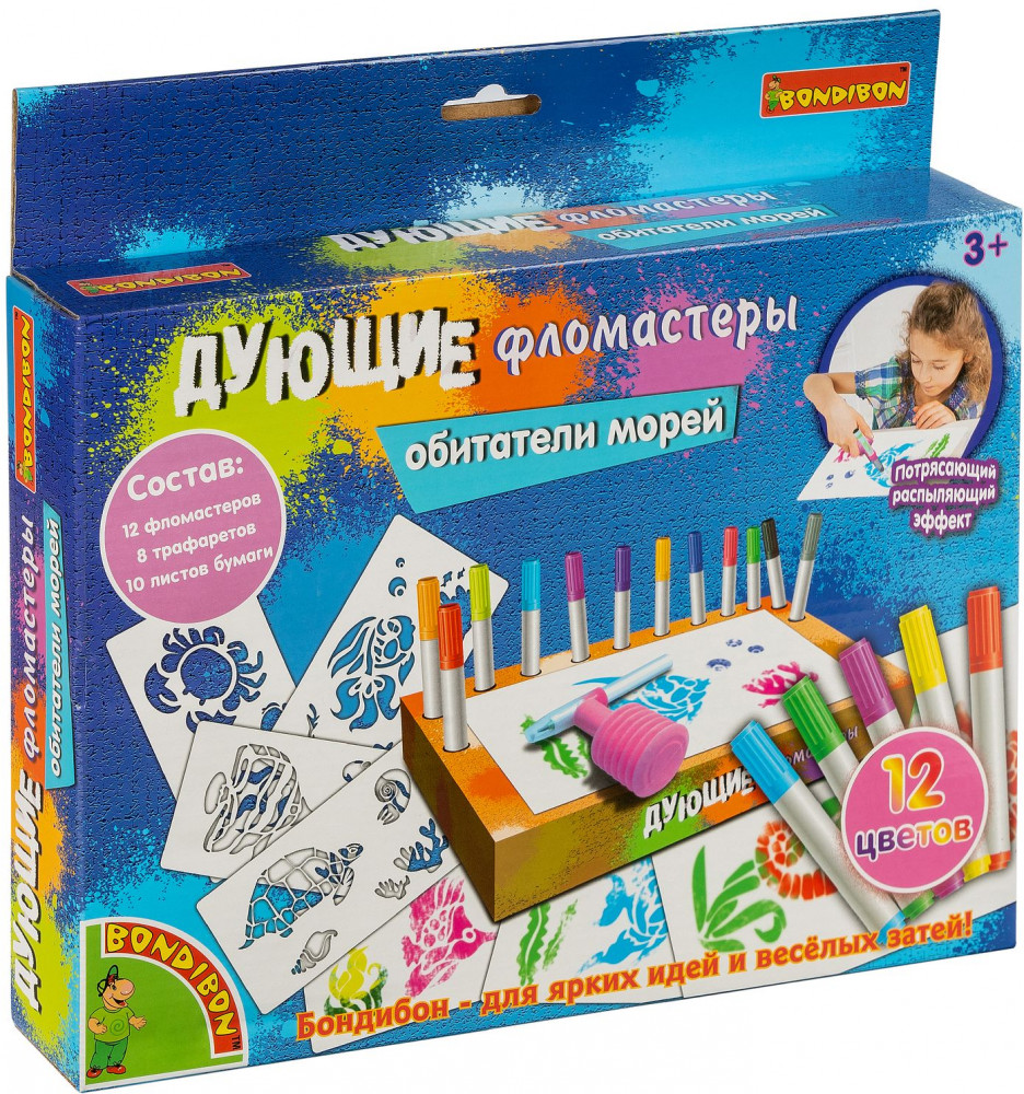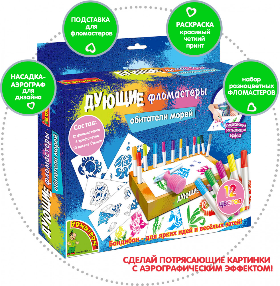 Дети любят рисовать дующими фломастерами, потому что это легко! Сделай потрясающие картинки с аэрографическим эффектом, используя трафареты и фломастеры из набора «Обитатели морей». Положи трафарет морского животного или растения на бумагу, выбери и распыли первый цвет, надев на фломастер распылитель, выбери и распыли остальные понравившиеся тебе цвета, сними распылитель с фломастера и дорисуй необходимые детали без него. Внутренняя вставка в коробке является подставкой для фломастеров. Товар сертифицирован и безопасен, предназначен для детей от 3 лет.