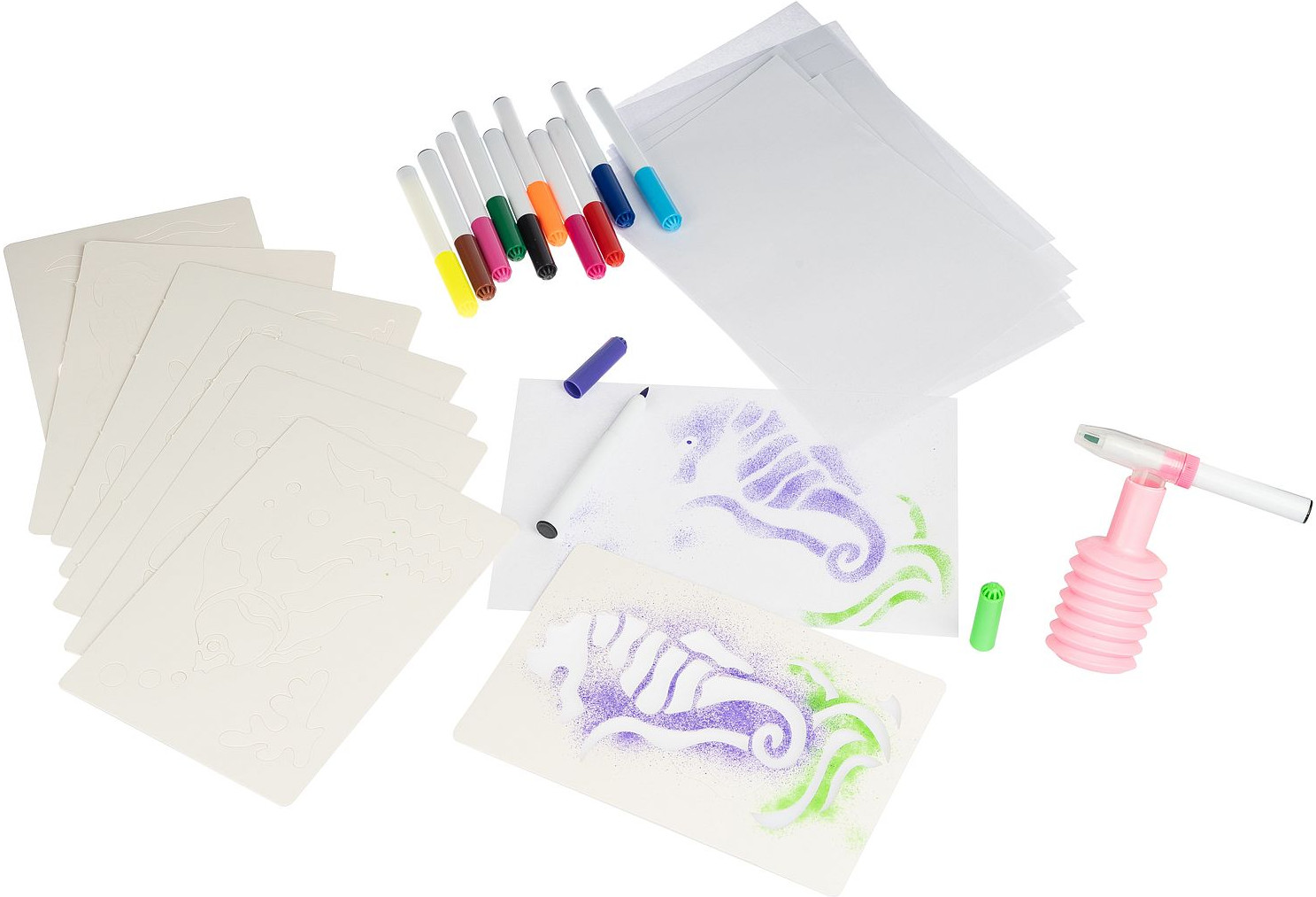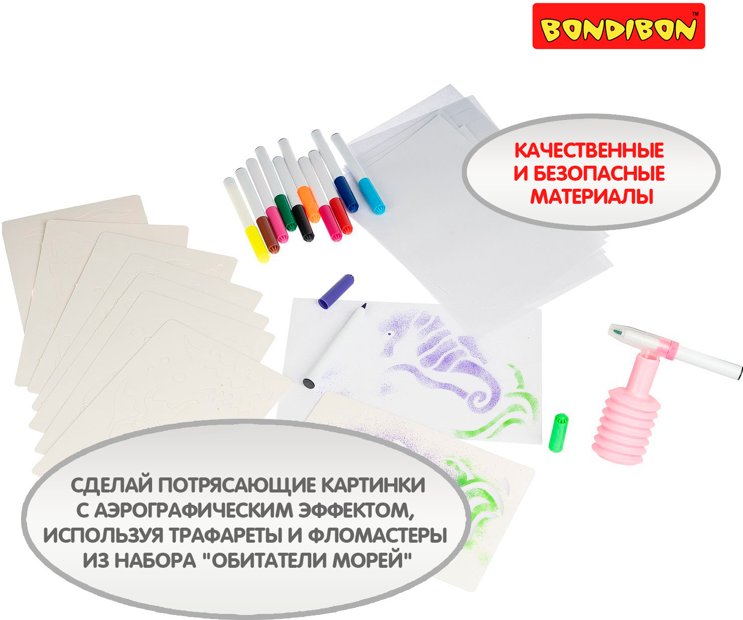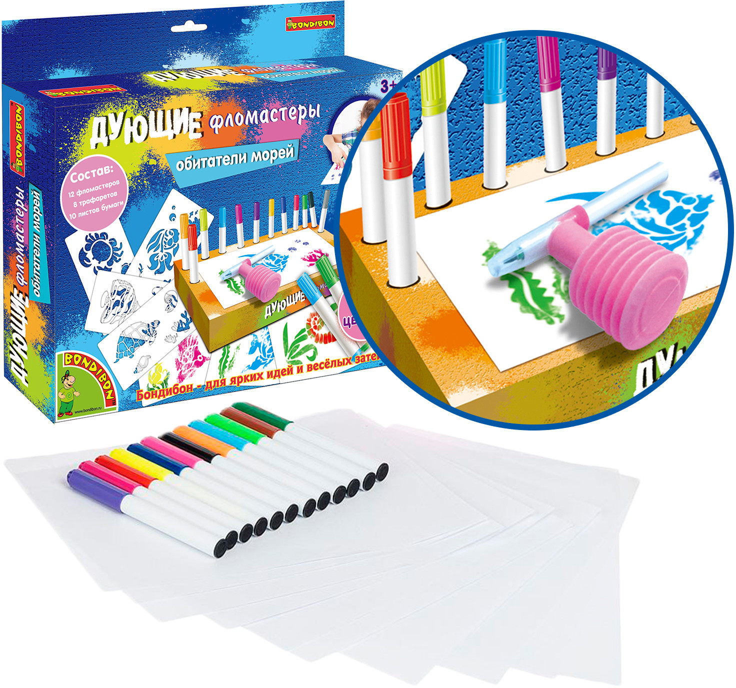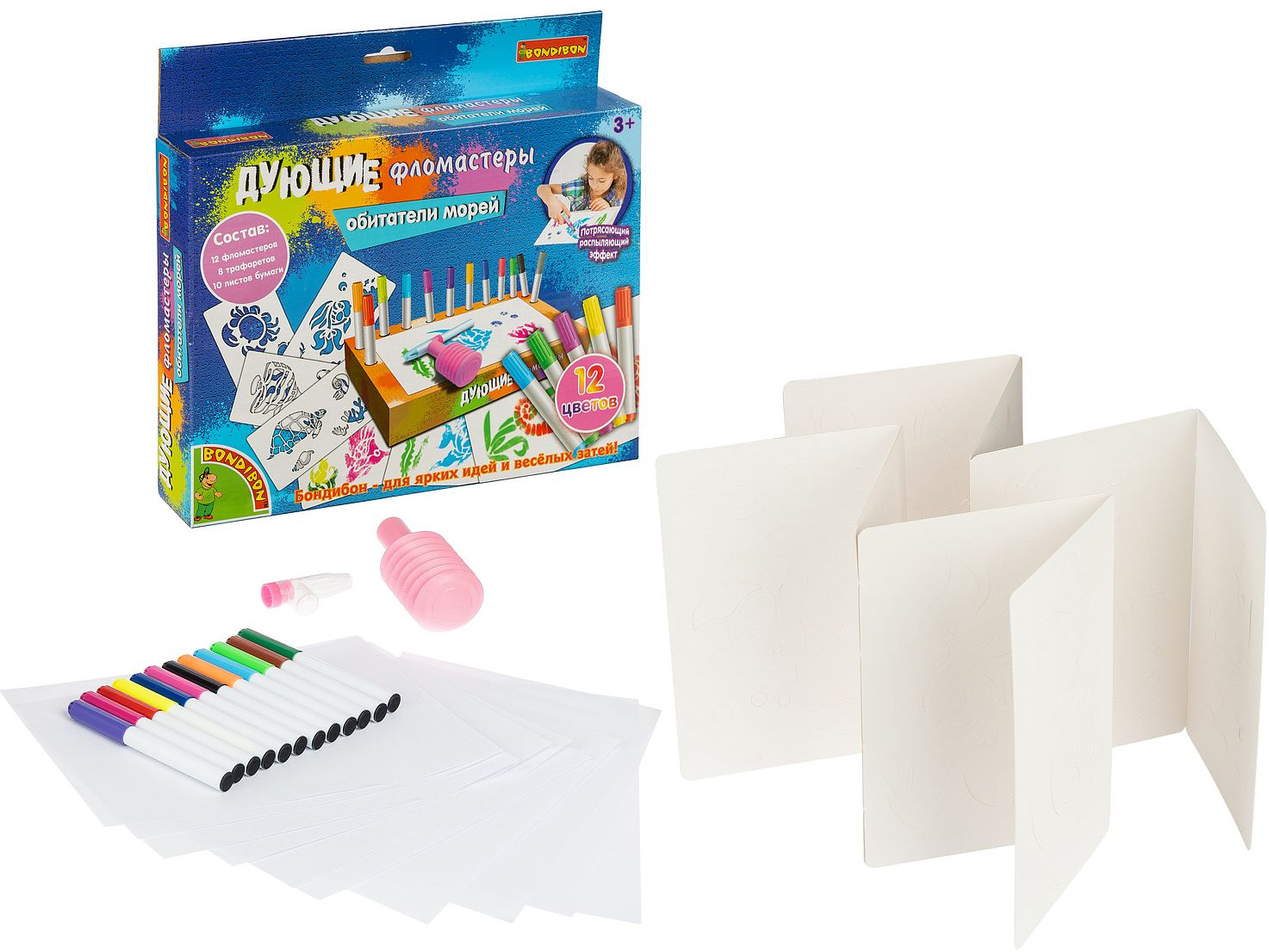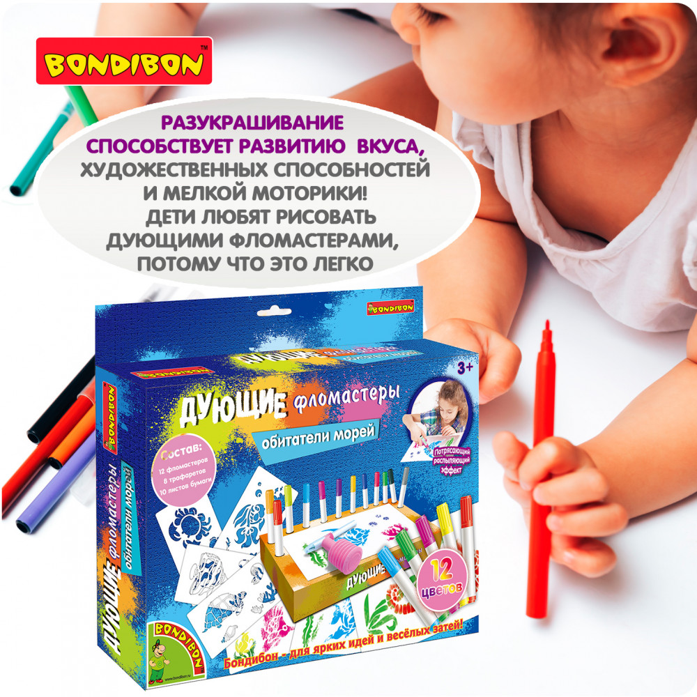 Дети любят рисовать дующими фломастерами, потому что это легко! Сделай потрясающие картинки с аэрографическим эффектом, используя трафареты и фломастеры из набора «Обитатели морей». Положи трафарет морского животного или растения на бумагу, выбери и распыли первый цвет, надев на фломастер распылитель, выбери и распыли остальные понравившиеся тебе цвета, сними распылитель с фломастера и дорисуй необходимые детали без него. Внутренняя вставка в коробке является подставкой для фломастеров. Товар сертифицирован и безопасен, предназначен для детей от 3 лет.