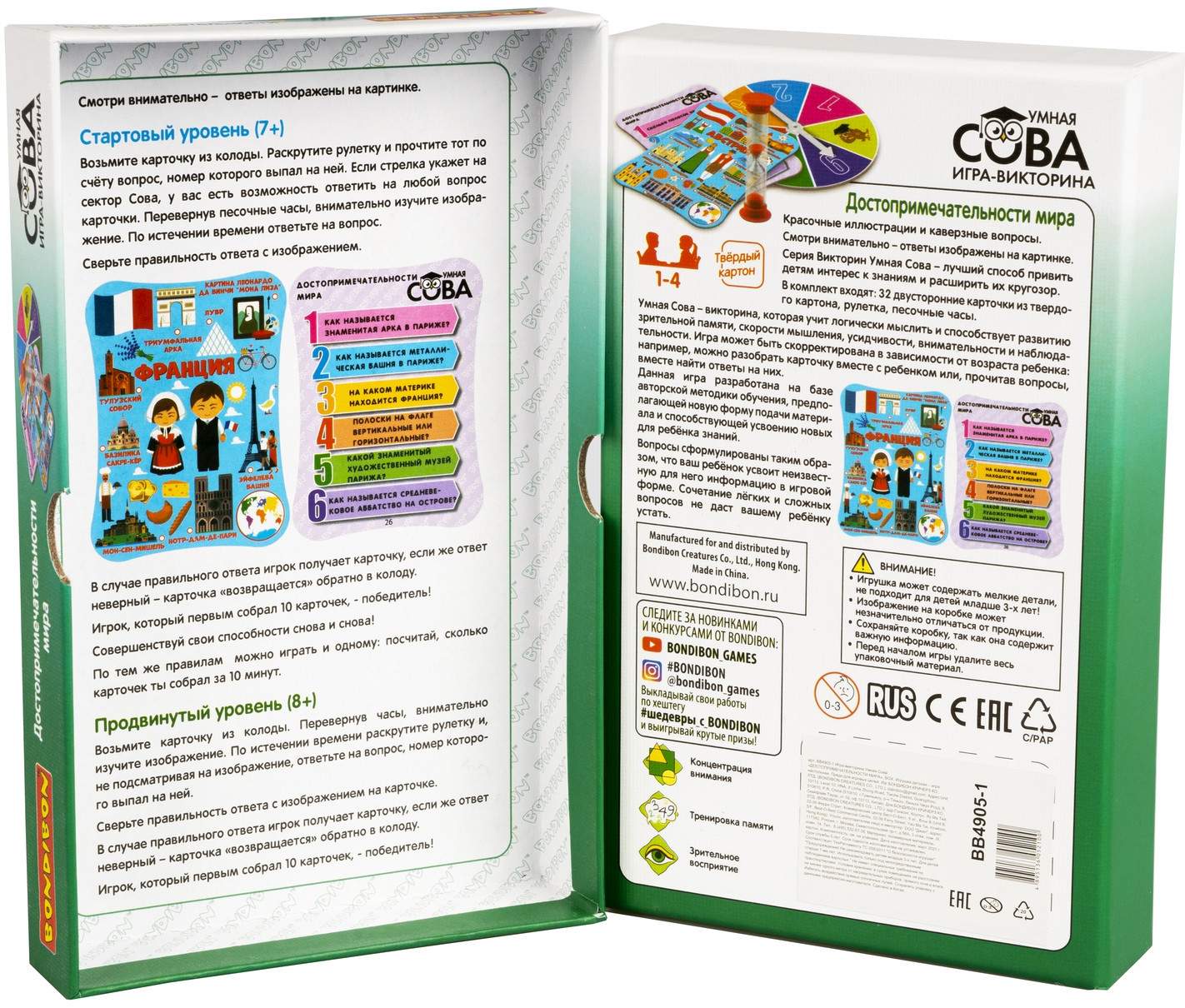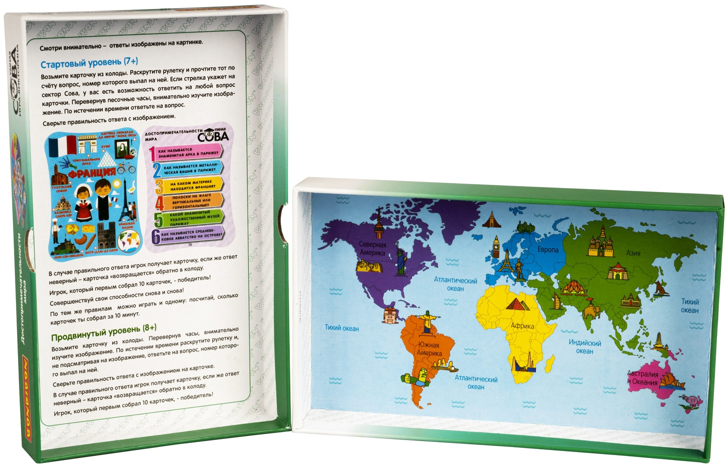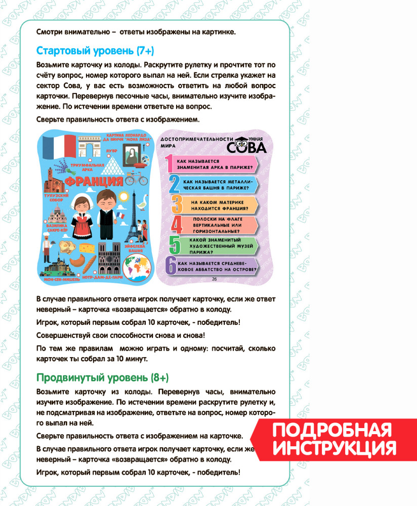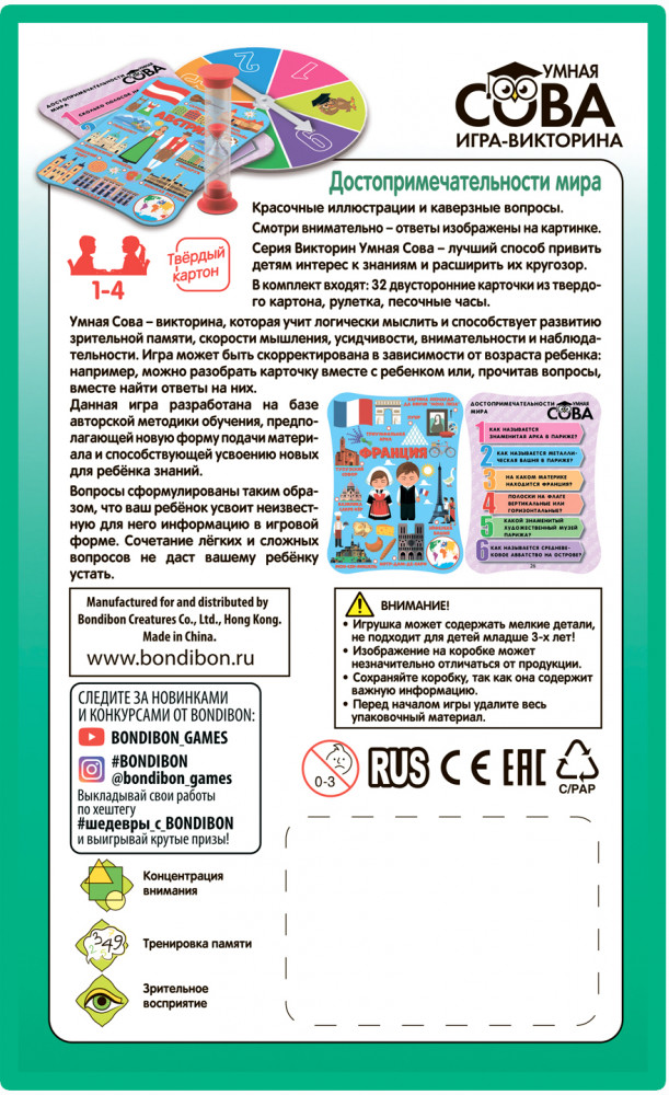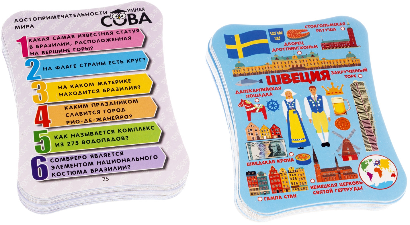 💳 Оплатить за товар можно при получении 🇰🇿 Есть бесплатная доставка по Казахстану от 1 дня 🎁 Копите бонусы с каждой покупки Серия: Умная сова Игра-викторина «Достопримечательности мира» серии «Умная Сова» от «Bondibon» — лучший способ привить детям интерес к знаниям и расширить их кругозор. Данная игра разработана на базе авторской методики обучения, предполагающей новую форму подачи материала и способствующей усвоению новых для ребёнка знаний о достопримечательностях различных стран мира, их культурных особенностях, национальном костюме и государственной символике. |