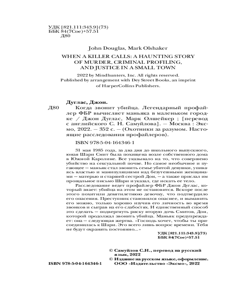 Остросюжетная и увлекательная, книга «Когда звонит убийца», наглядно показывает, как изучение криминальной психологии помогает раскрыть дело и встретиться лицом к лицу с садистом и безжалостным убийцей. |