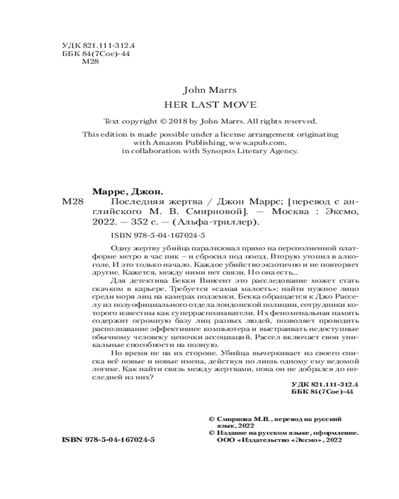Последняя жертваВ данный момент этот товар отсутствует в продаже. Возможно, у нас найдется аналогичный или похожий товар здесь. Серия: Альфа-триллер От автора бестселлера «The One. Единственный». |
