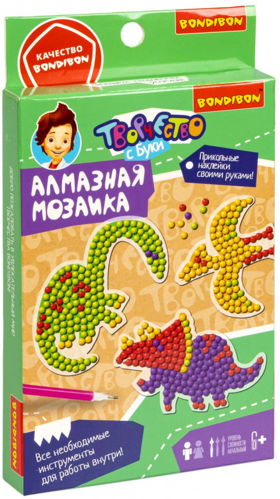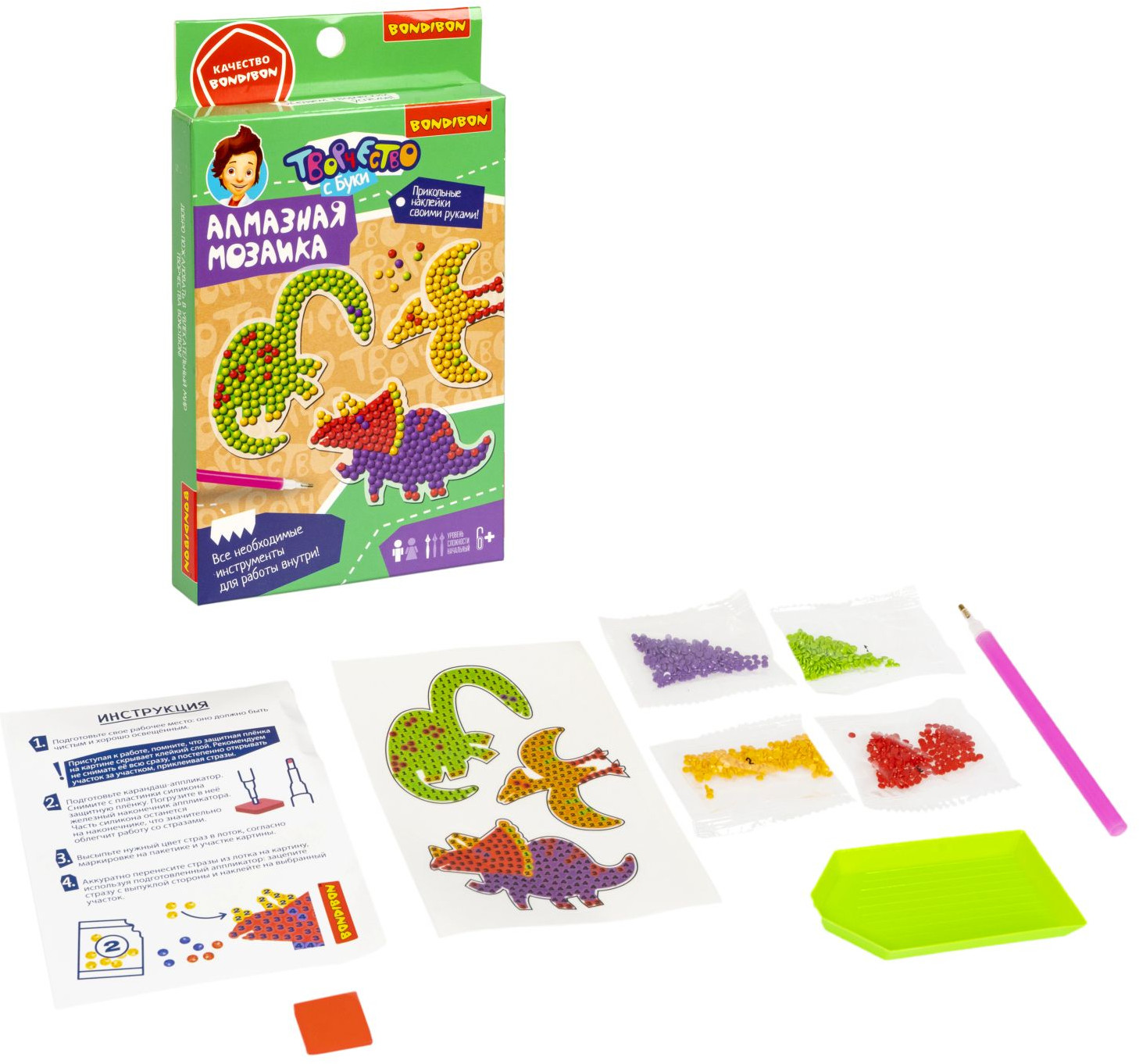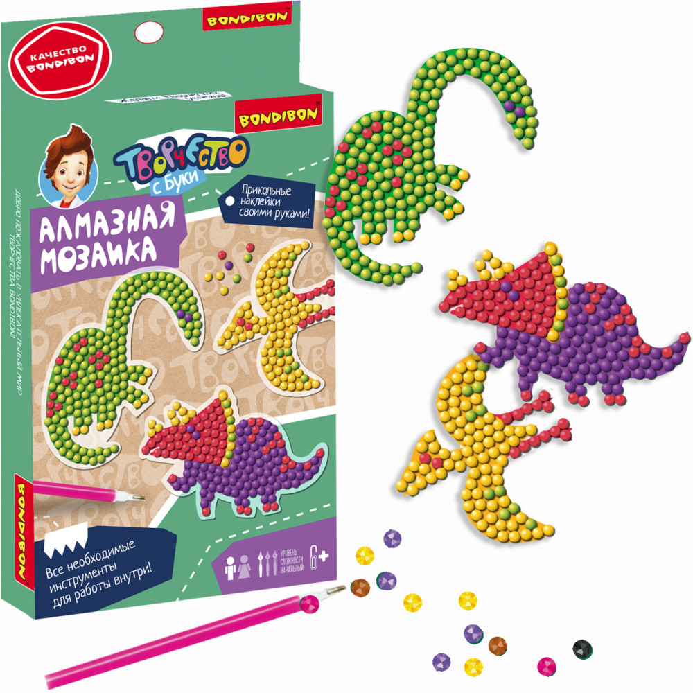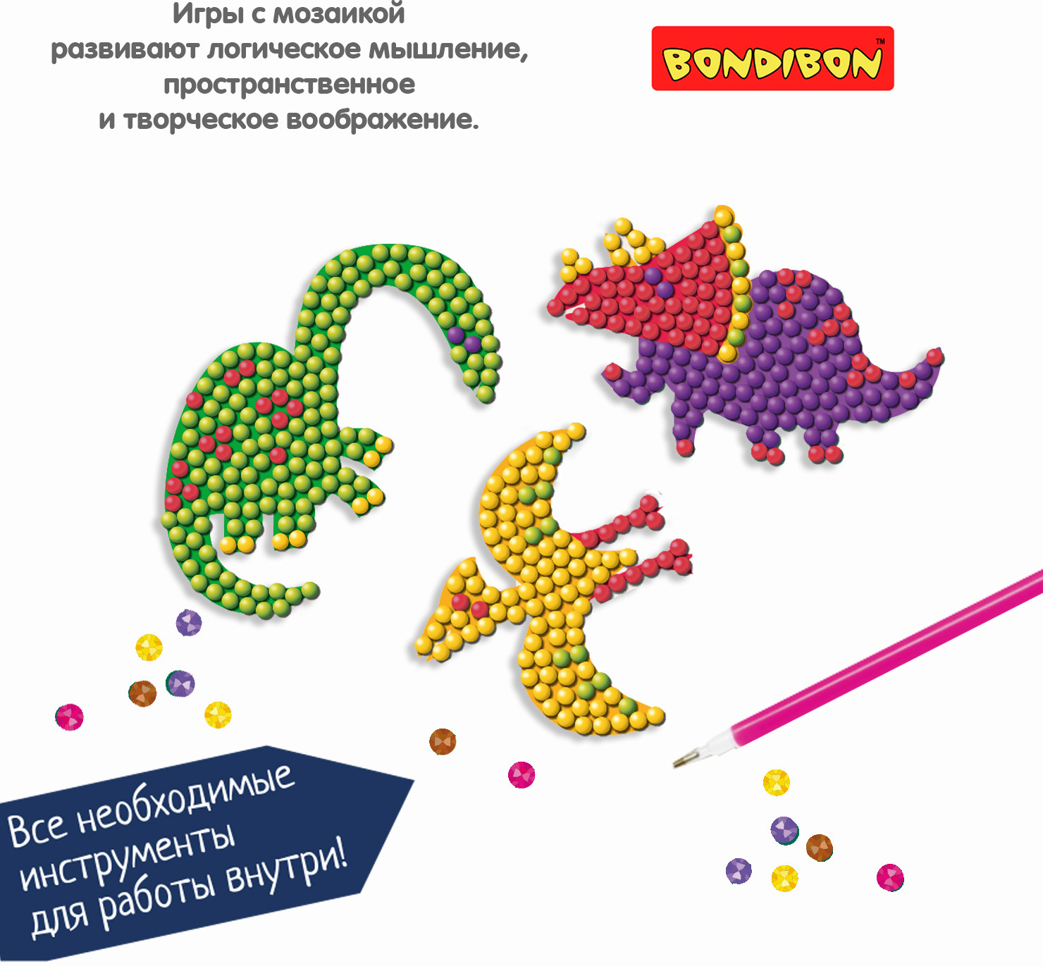 Дино — раз, дино — два, дино — три! Три блестящих динозавра в уникальном наборе для творчества от «Bondibon»! Красочные переливы каждого алмазика — фрагмента мозаики превращают творческий процесс в настоящее волшебство! Выкладывание страз прекрасно успокаивает, способствует снижению стресса, а также развивает мелкую моторику и цветовосприятие. Такое творчество привьет ребенку усидчивость и терпение, поможет развитию воображения.