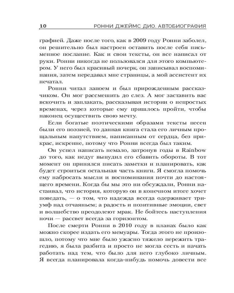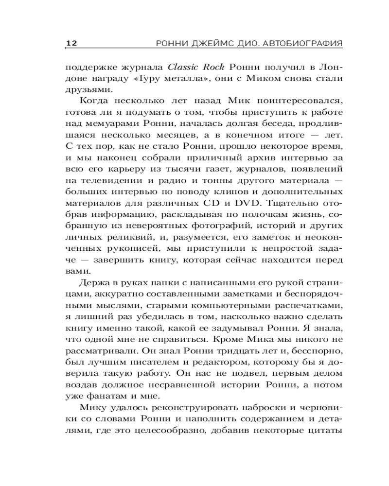 Журналист Мик Уолл бесчисленное количество раз брал у Дио интервью, неоднократно был в гостях и до последних дней оставался другом Ронни. Венди попросила Мика Уолла добавить деталей и доработать рукопись. При этом в книге сохраняется непринужденный разговорный тон, передающий манеру общения Ронни.