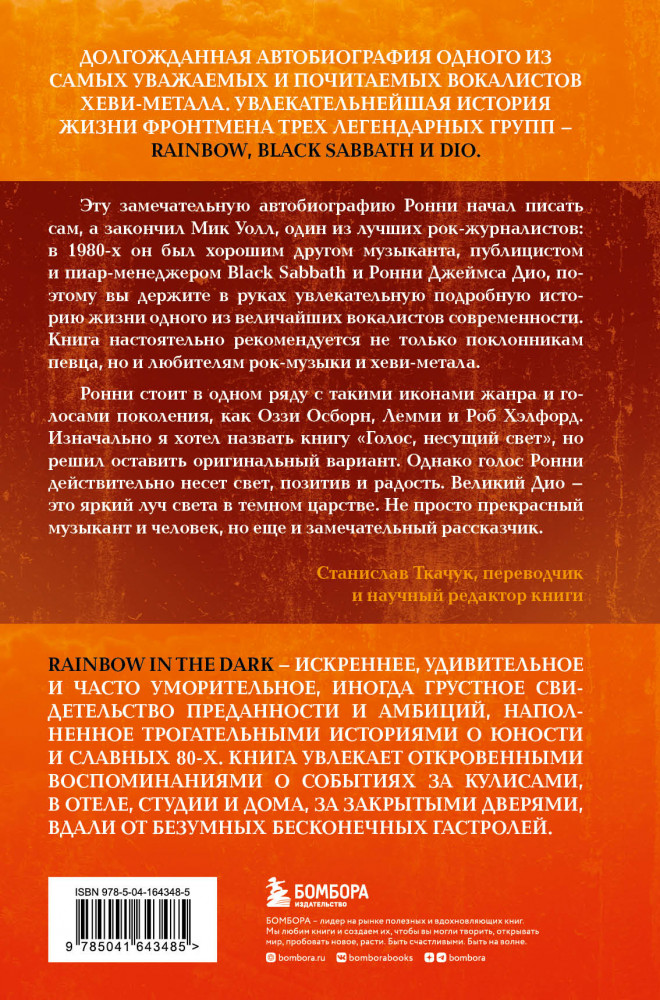 Все описано искренне и подробно, начиная с ссоры с Блэкмором и заканчивая наркотиками, омрачившими воскрешение Black Sabbath, личностными конфликтами, неслабо потрепавшими нервы каждой из трех групп. «Rainbow in the Dark» — искреннее, удивительное, часто уморительное, а иногда и грустное свидетельство преданности и амбиций, наполненное трогательными историями о юности и славных 80-х.