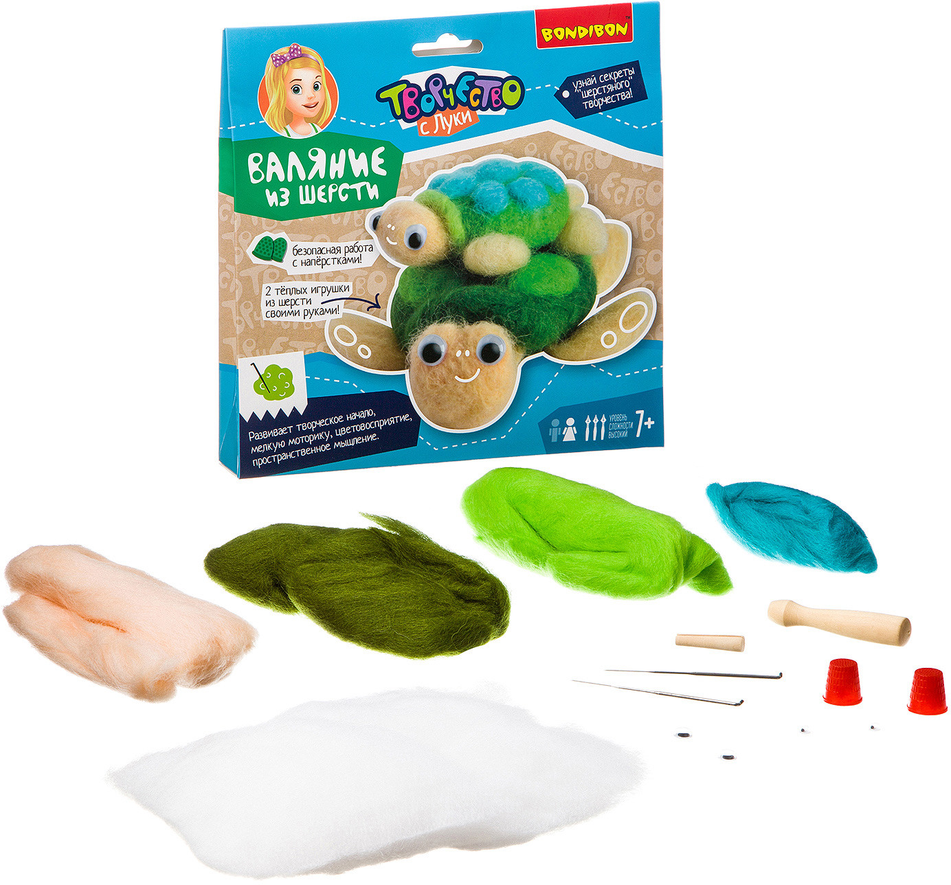 Bondibon Валяние из шерсти «Черепашки»В данный момент этот товар отсутствует в продаже. Возможно, у нас найдется аналогичный или похожий товар здесь. Серия: Творчество с Луки Этот набор от Bondibon обучит валянию из шерсти — экологически чистого материала. Подробная инструкция и схема работы обучит новому виду рукоделия с нуля. Итогом станет уникальная, теплая, тактильно приятная игрушка, созданная своими руками. Всё необходимое и немного больше — в комплекте: набор шерсти различных цветов, набивной материал, инструменты для валяния (иглы, наперстки), элементы украшения, подробная инструкция. |