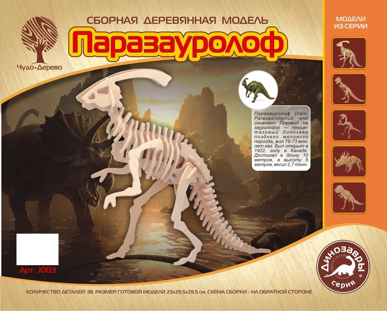 Чудо-Дерево Модель сборная деревянная «Паразавролоф»В данный момент этот товар отсутствует в продаже. Возможно, у нас найдется аналогичный или похожий товар здесь. Серия: Динозавры Детали изготавливаются из фанерной доски и собираются согласно инструкции. Собираются без клея. Если вы хотите чтобы собранная модель служила Вам долго, то лучше все таки проклеивать места соединения клеем сразу при сборке. Вы можете раскрасить Вашу модель, используя любые краски. Производитель рекомендует использовать темперные краски. После можно покрыть лаком. Игрушки из этой серии развивают усидчивость, пространственное и абстрактное мышление. Выполнены из экологически чистой древесины. |
