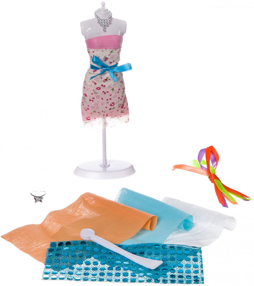 В набор входит: выкройки-лекала будущей одежды, манекен для примерок, разнообразные ткани и украшения, ленты, колье, пуговички, стразы, портновские иглы, наперсток и инструкция с основами швейного мастерства.