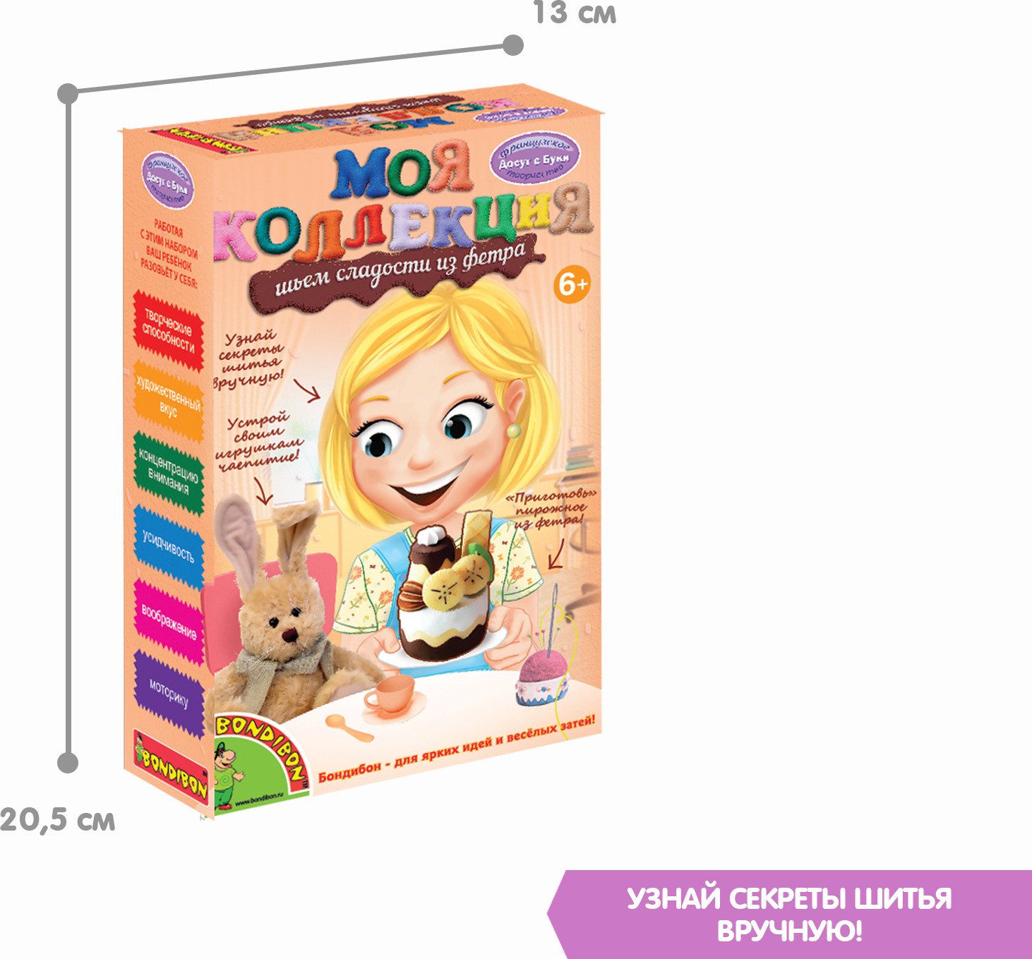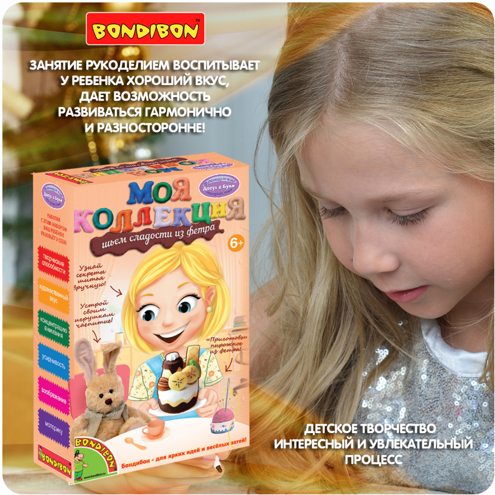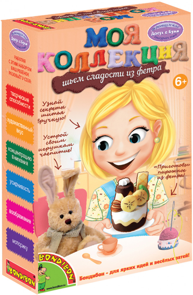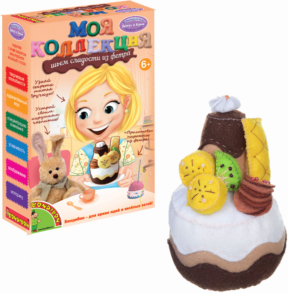 Bondibon Набор для творчества «Шьем сладости из фетра. Пирожное Банан»В данный момент этот товар отсутствует в продаже. Возможно, у нас найдется аналогичный или похожий товар здесь. Серия: Досуг с Буки Наборы «Шьем сладости из фетра» позволят девочке сшить пирожное с дольками апельсина и вишенкой в ванильной глазури, пирожное с дольками бананов в шоколаде, шоколадное пирожное с печеньем и заварным кремом, пирожное с клубникой и листьями мяты или пирожные в форме бублика и сердечка! Пусть порадует себя и любимые игрушки угощениями к чаю! Работа с набором развивает творческие способности, художественный вкус, концентрацию внимания, усидчивость, воображение и моторику. |
