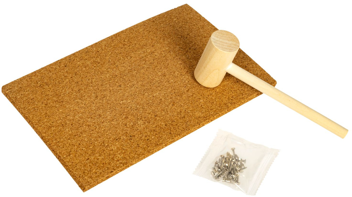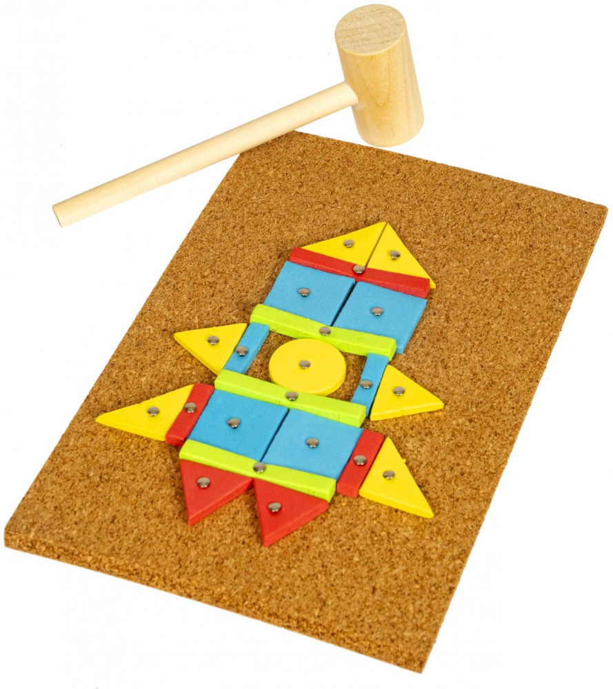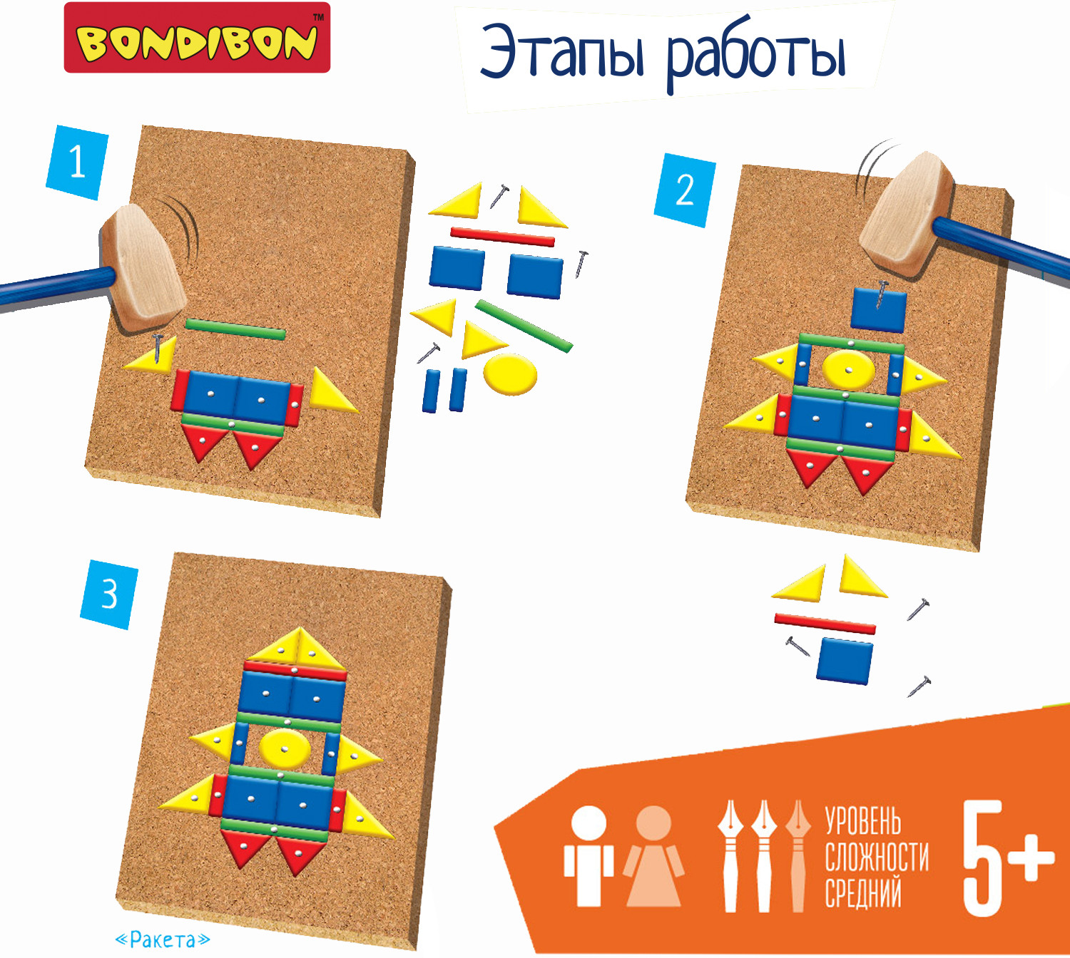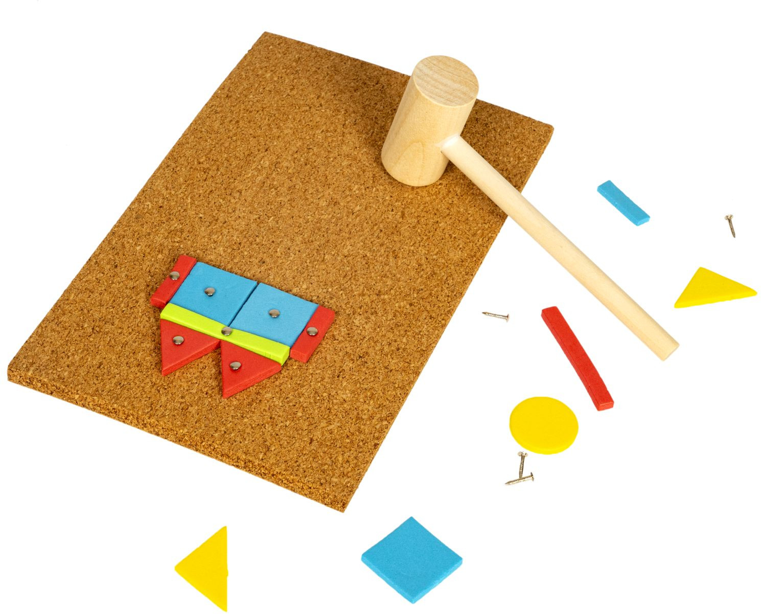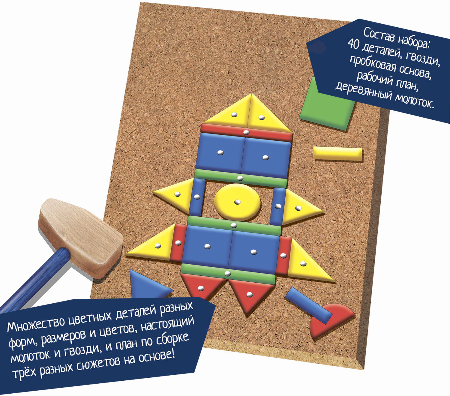Серия: Творчество с Буки Увлекательная игра предполагает создание картинок из деталей, прикрепляемых к основе с помощью гвоздиков. В состав входят: пробковая основа, молоточек, гвоздики, яркие детали из EVA разной формы и инструкция с картинками-примерами. Чтобы прикрепить деталь к основе, нужно аккуратно вставить в нее гвоздик и прибить его молоточком к основе. Особых усилий не требуется, детали и пробковая основа мягкие, поэтому гвоздики легко входят в них. Также легко разобрать созданные картинки. Игра отлично тренирует мелкую моторику рук и глазомер ребенка, воображение и фантазию. Гвоздики в игре маленькие и достаточно острые, поэтому, если Вы предложите игру маленькому ребенку нужно, чтобы он постоянно находился под Вашим контролем. |
