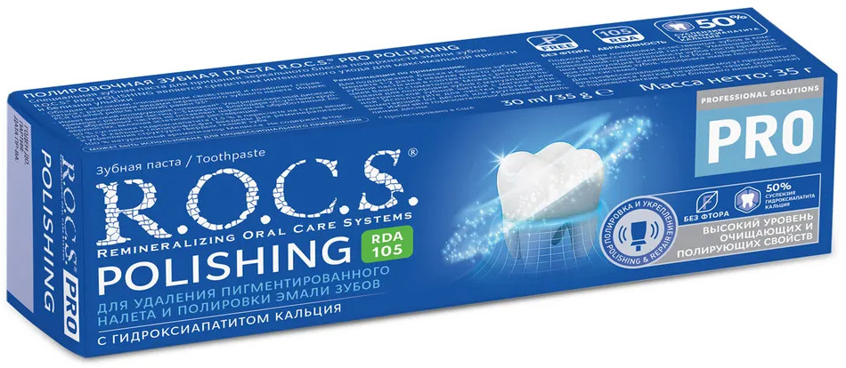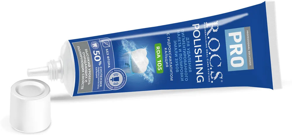 R.O.C.S. Зубная паста «Pro Polishing»-20% +104 удаляет налёт экономичный расход быстрый эффект маленький объём слабое отбеливание