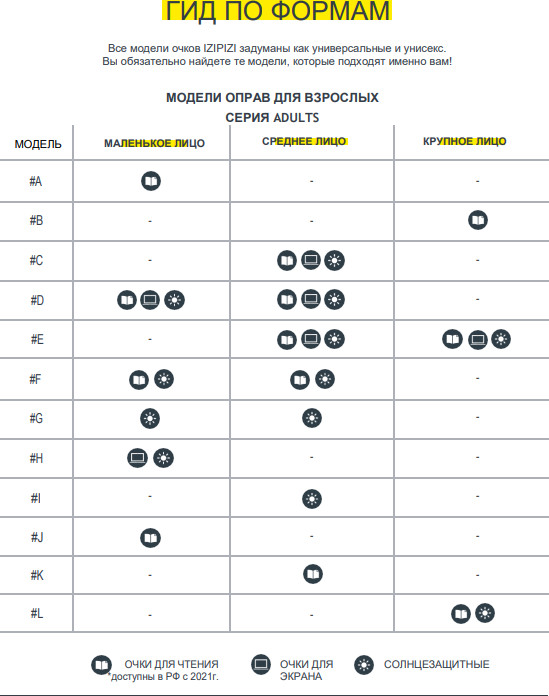 Примечание: в фотографиях есть таблица по подбору оправы для определённого типа лица.