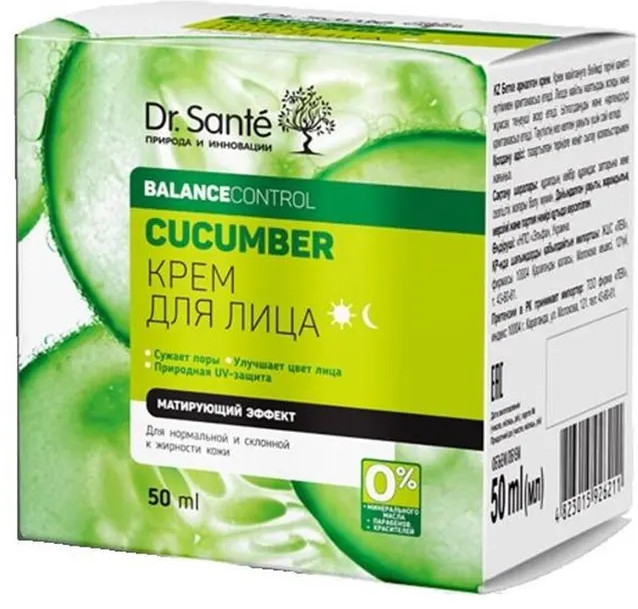 Dr.Sante Крем для лицаВ данный момент этот товар отсутствует в продаже. Возможно, у нас найдется аналогичный или похожий товар здесь. Серия: Cucumber Крем обеспечивает необходимый уход за нормальной и склонной к жирности кожей. Мгновенно устраняет жирный блеск и оказывает мягкий матирующий эффект. Обеспечивает увлажнение и питание. Подходит для любого времени суток. Матирование кожи, сужение пор, регуляция работы сальных желез. Экстракты огурца и лимона нормализуют процесс кератинизации и регулирует работу сальных желез. Масло ши и экстракт ройбуша — природные UV-фильтры, защищают от негативного воздействия солнечных лучей, продлевая молодость кожи. Увлажняют и питают, обеспечивают витаминами. |