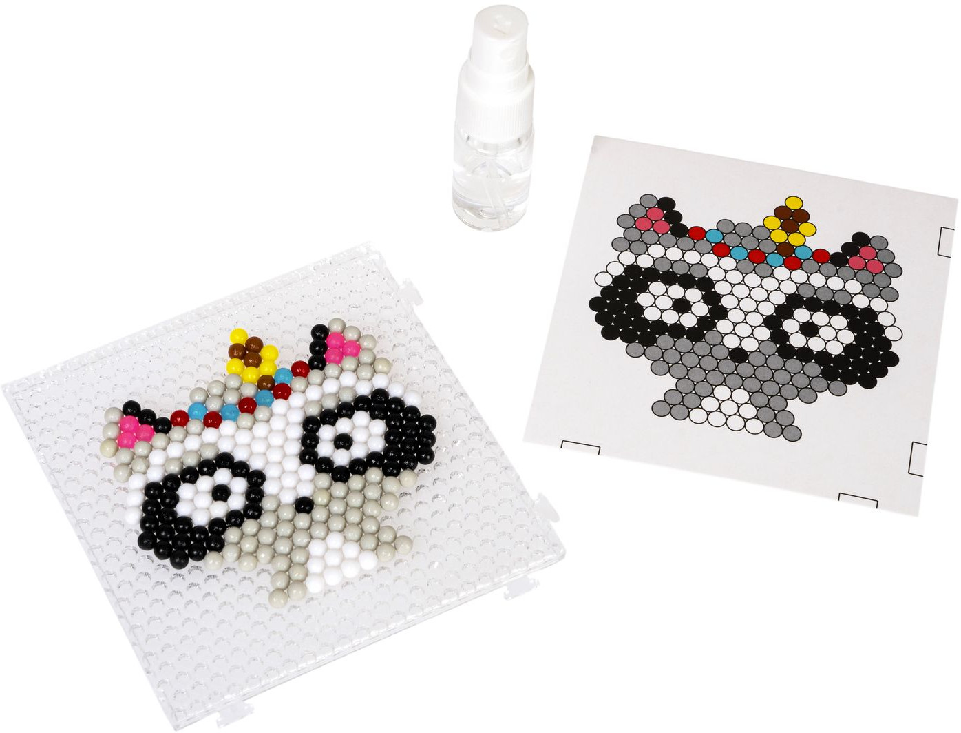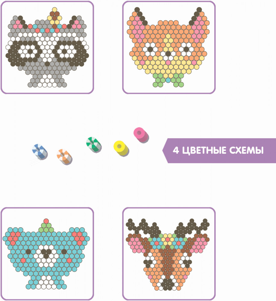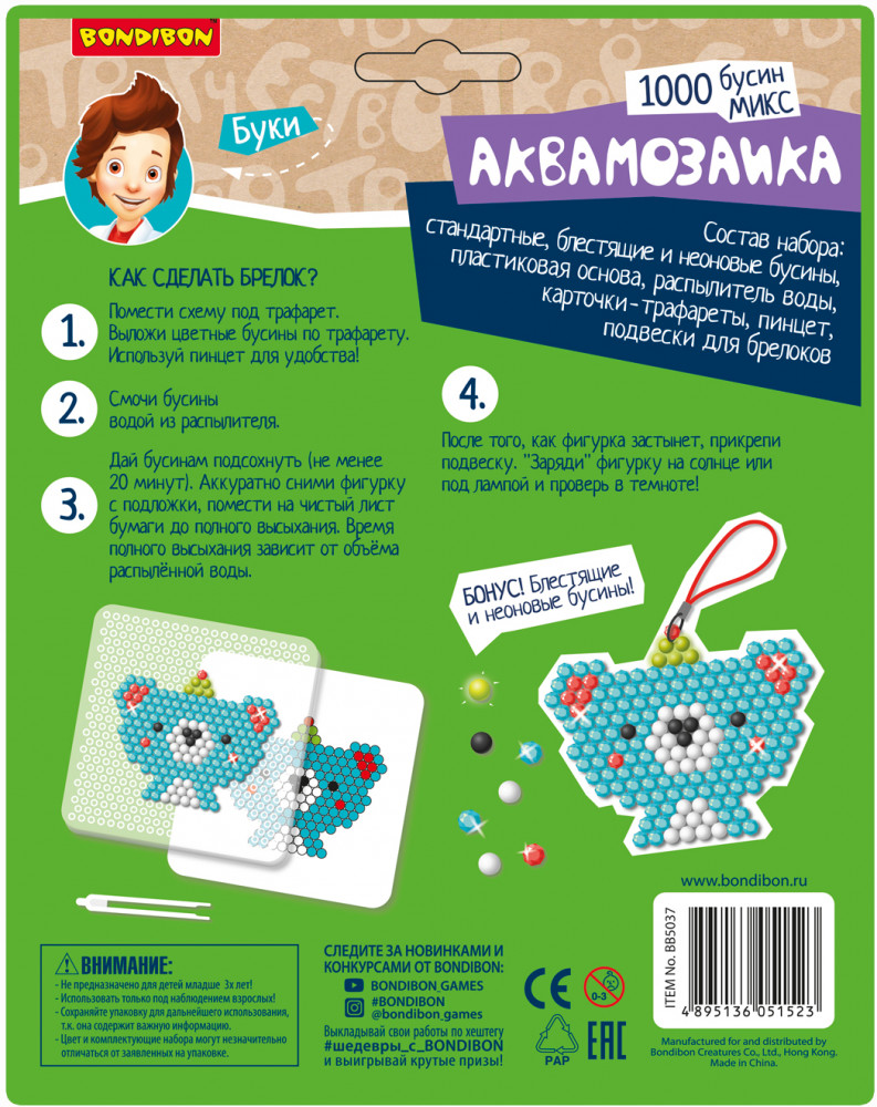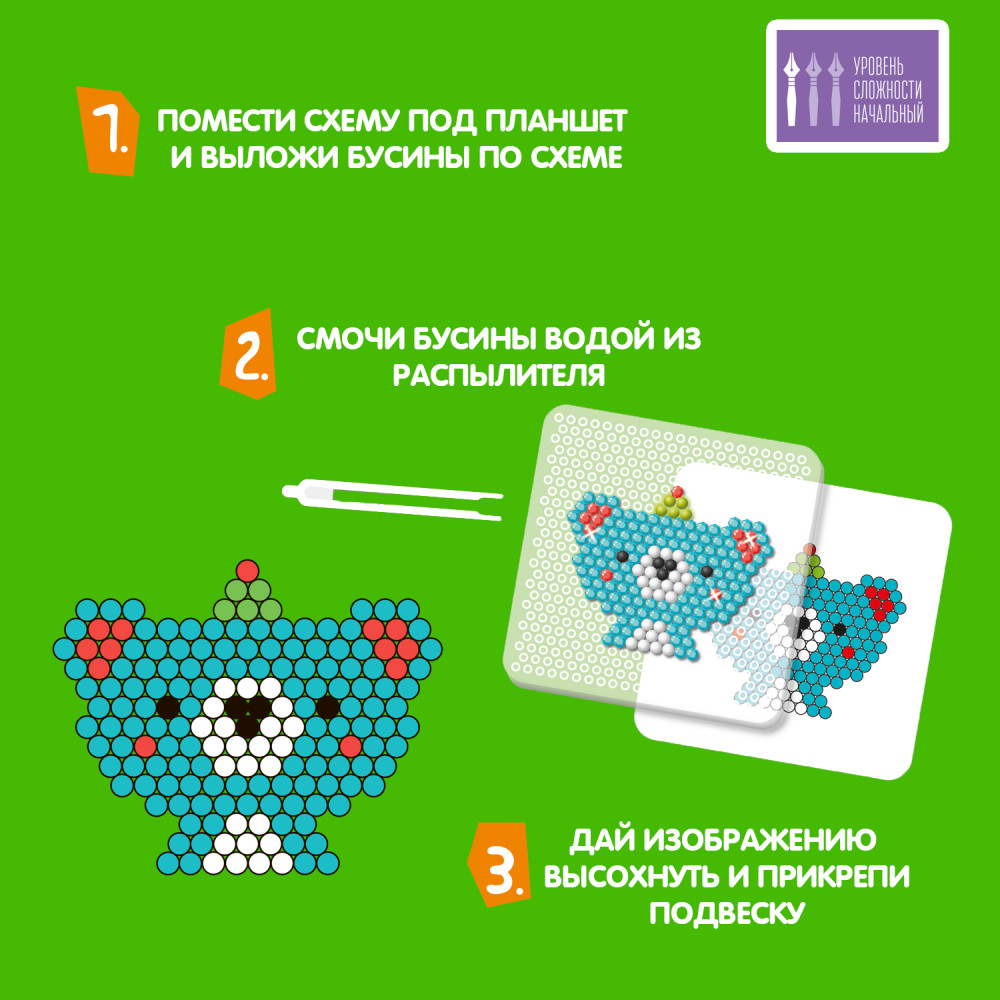 3 шага и аквамозаика готова — помещаете схему под трафарет и выкладываете бусины, смачиваете их водой из распылителя, даете бусинам высохнуть, снимаете фигурку с подложки и помещаете ее на чистый лист. После того, как все высохнет, прикрепляете подвеску. «Заряжаете» фигурку на солнце или под лампой и проверяете ее в темноте. Брелок из фигурки — отличный подарок близким своими руками. В комплекте есть неоновые и блестящие бусины, что сделает лесного жителя еще красивее. В наборе: стандартные, блестящие и неоновые бусины, пластиковая основа, распылитель воды, карточки трафареты и подвески для брелоков.