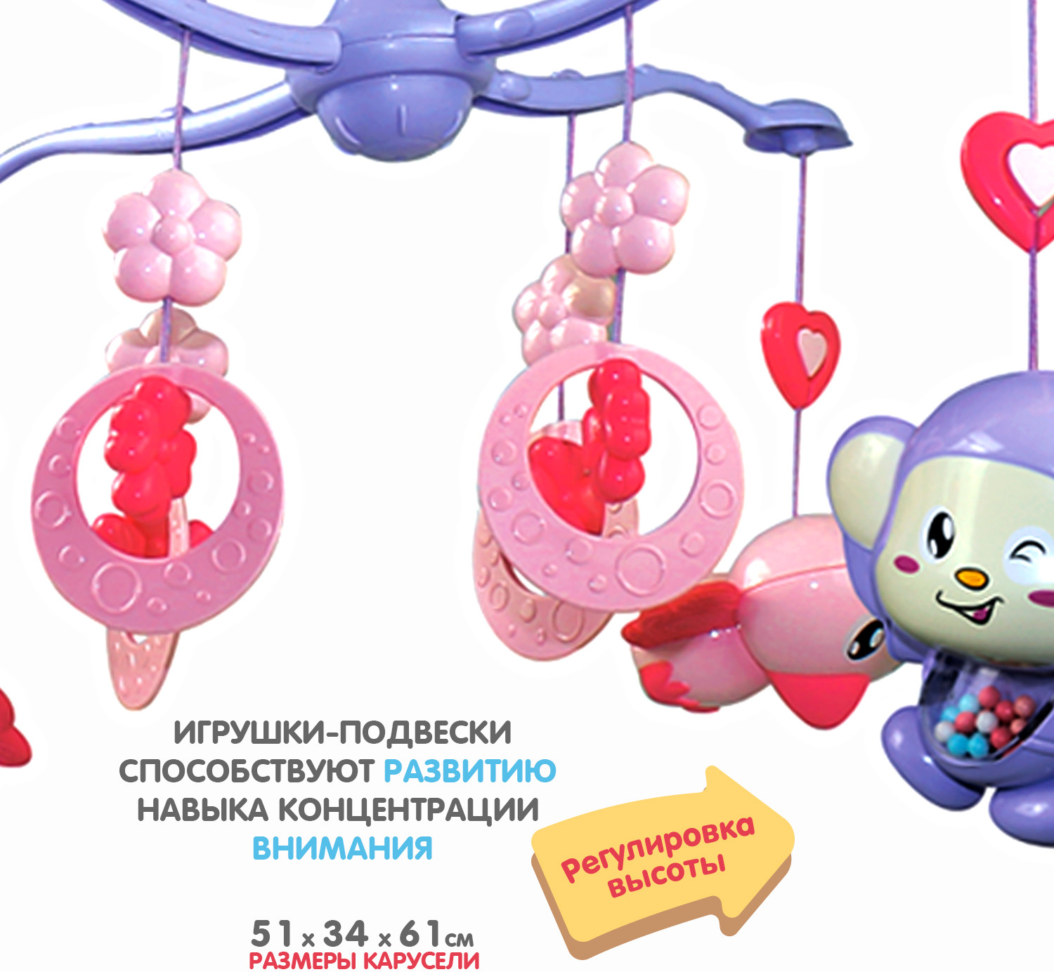 Эта игрушка растет вместе с младенцем. Малыши начинают наблюдать за подвешенными игрушками. Наблюдая за кружащимися фигурками карусели, слушая музыку, ребенок развивает слух и зрение, учится концентрировать внимание.