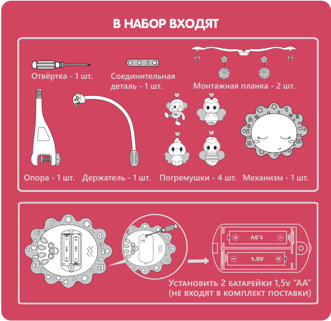 • для работы мобиля необходимы 2 пальчиковые батарейки (не входят в комплект).