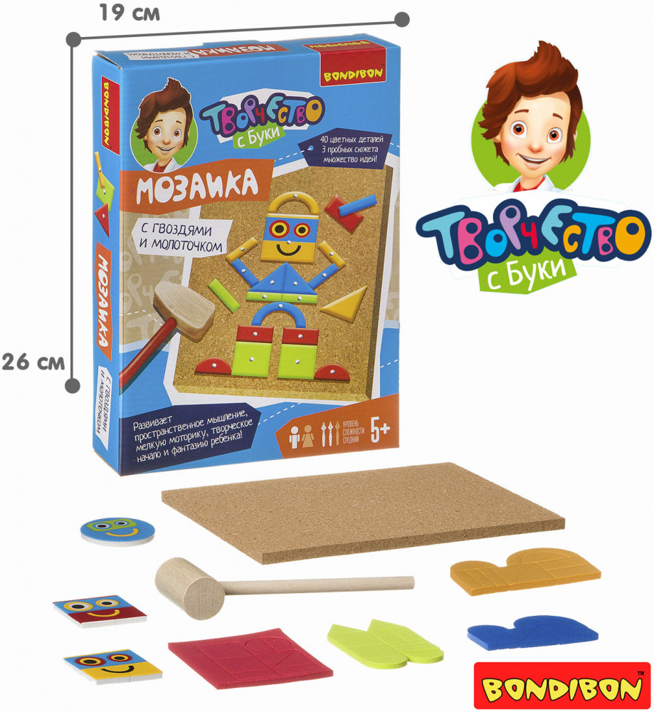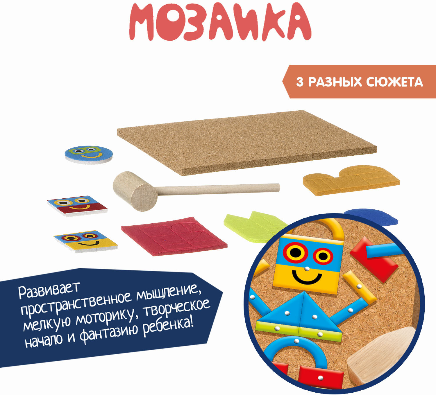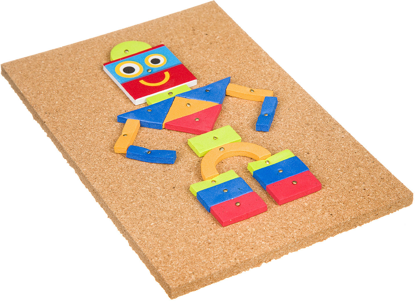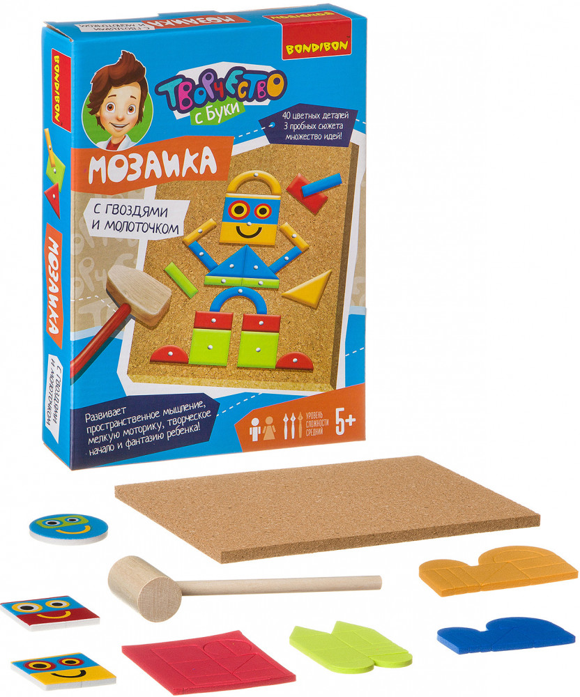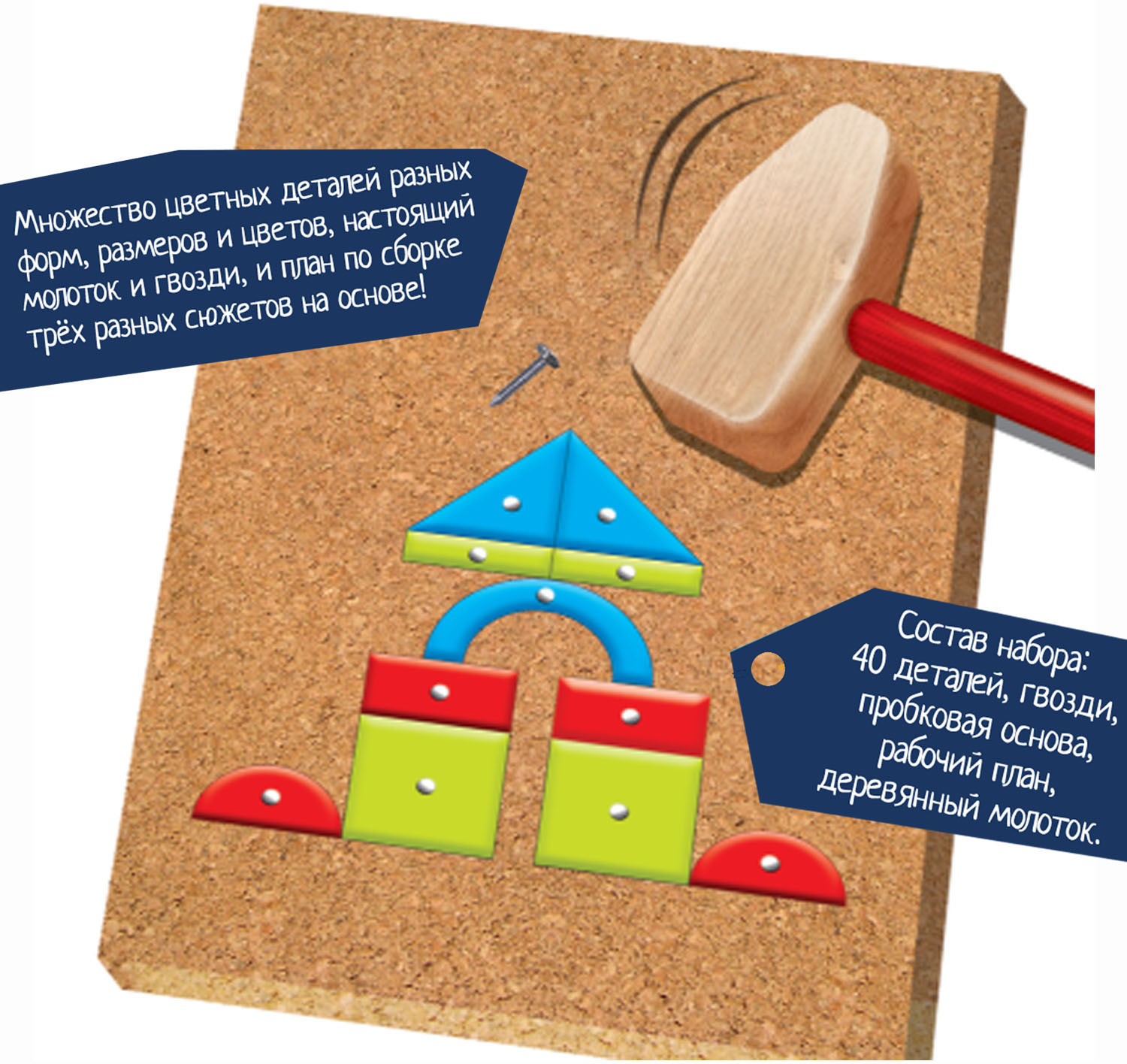 В состав входят: пробковая основа, молоточек, гвоздики, яркие детали из EVA разной формы и инструкция с картинками-примерами.