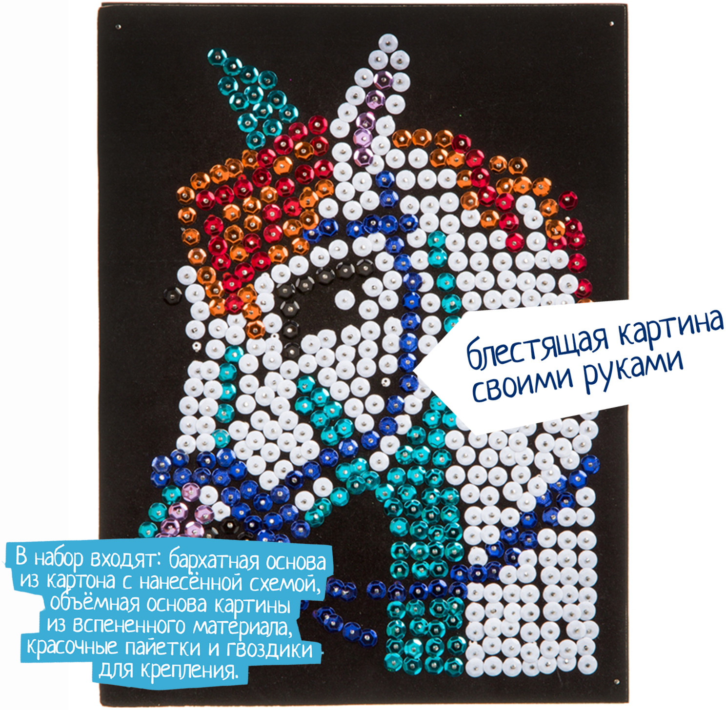В набор входит: более 500 пайеток, бархатная основа из картона с нанесенной схемой, объемная основа картины из вспененного материала, гвоздики для крепления пайеток.