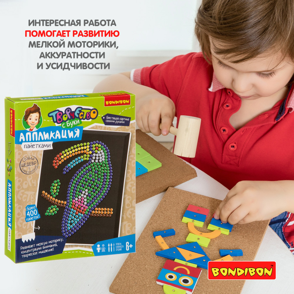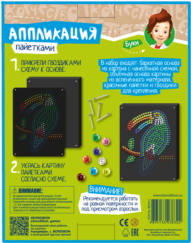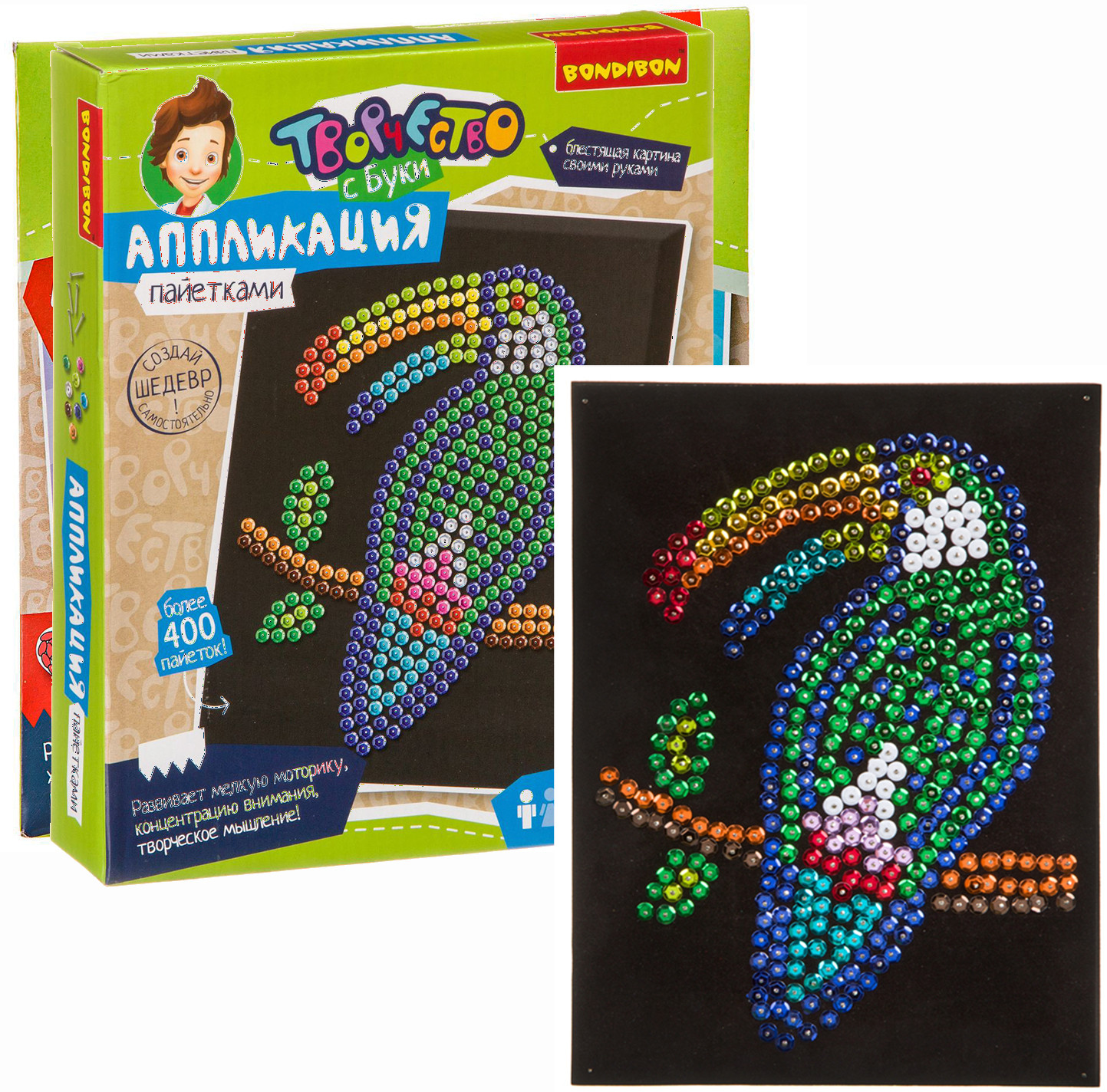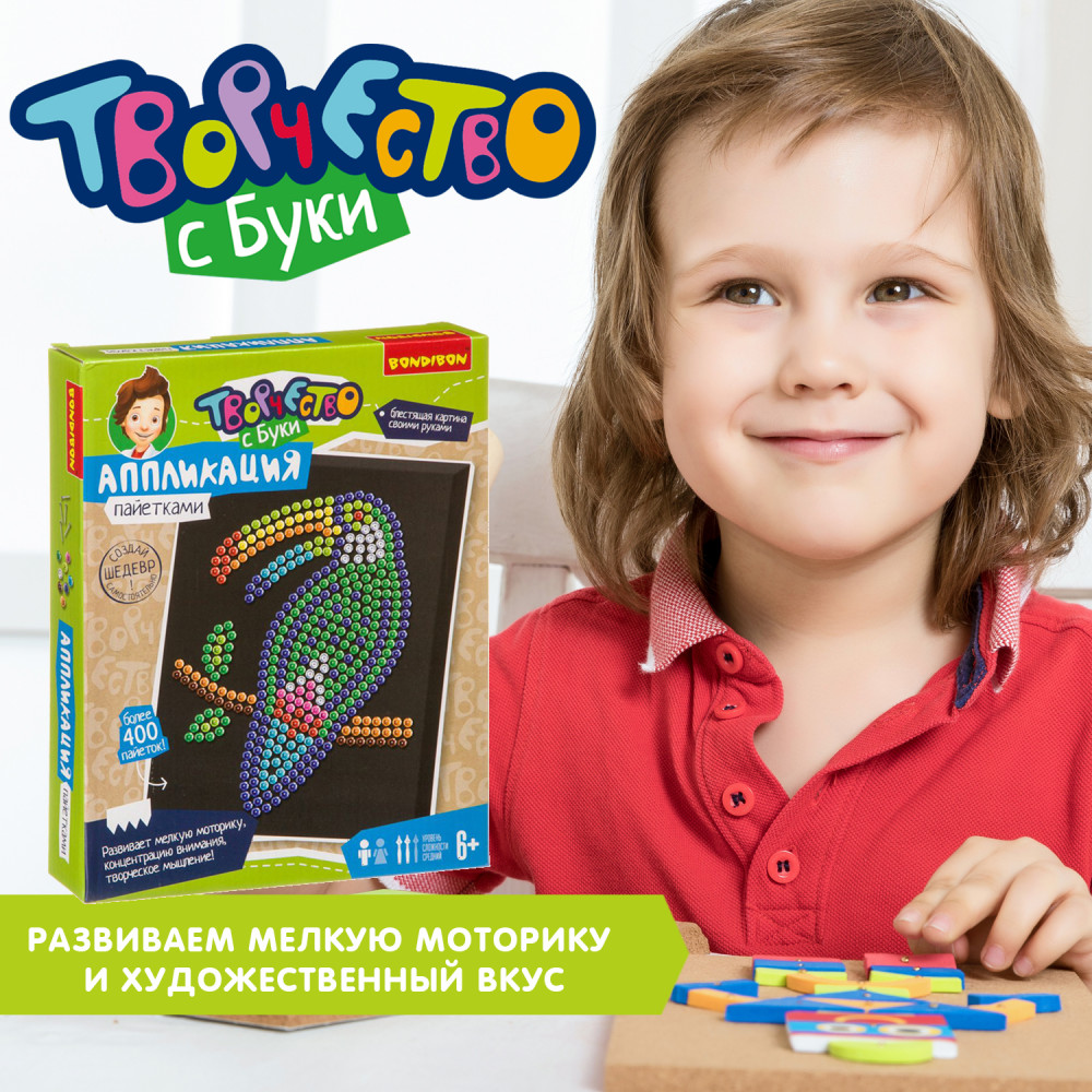 Bondibon Аппликация пайетками «Птица тукан»В данный момент этот товар отсутствует в продаже. Возможно, у нас найдется аналогичный или похожий товар здесь. Серия: Творчество с Луки Аппликация из пайеток — увлекательный и завораживающе красивый вид творчества. Работа с этим набором поможет развить мелкую моторику, концентрацию внимания и творческое мышление. По итогу Вы получите очень красивую картину с изображением сверкающей экзотической птицы тукан, а также море хорошего настроения и творческого вдохновения! |