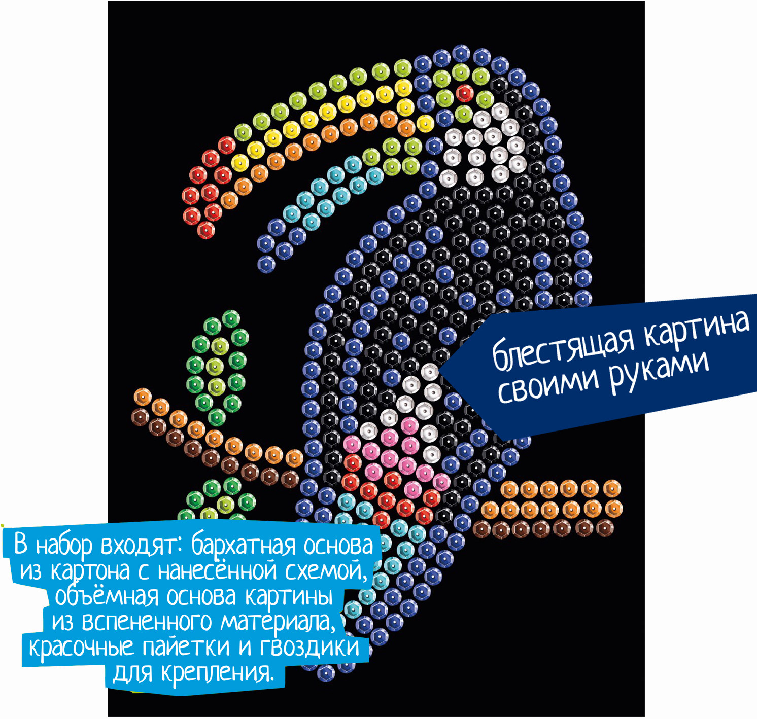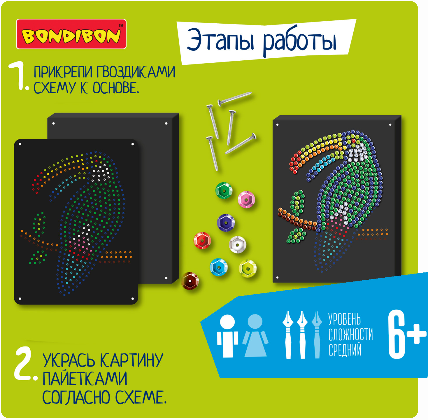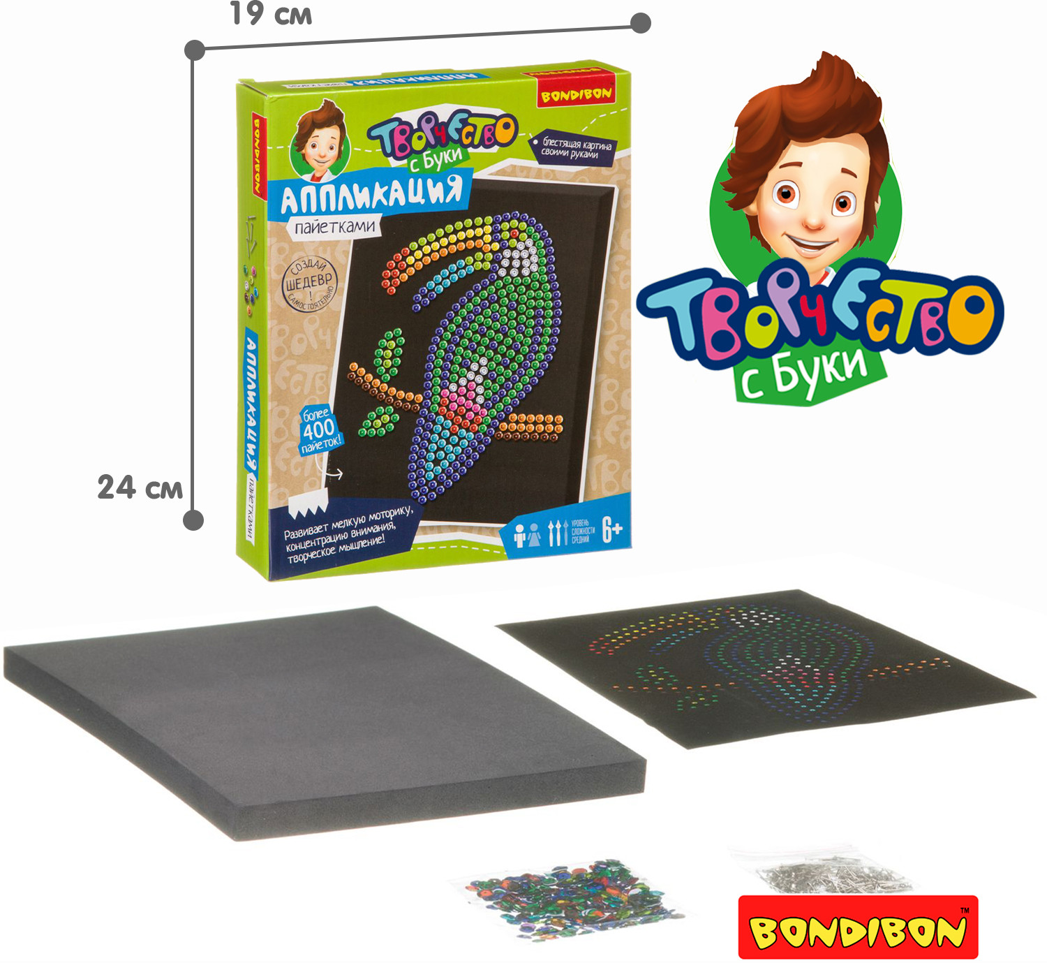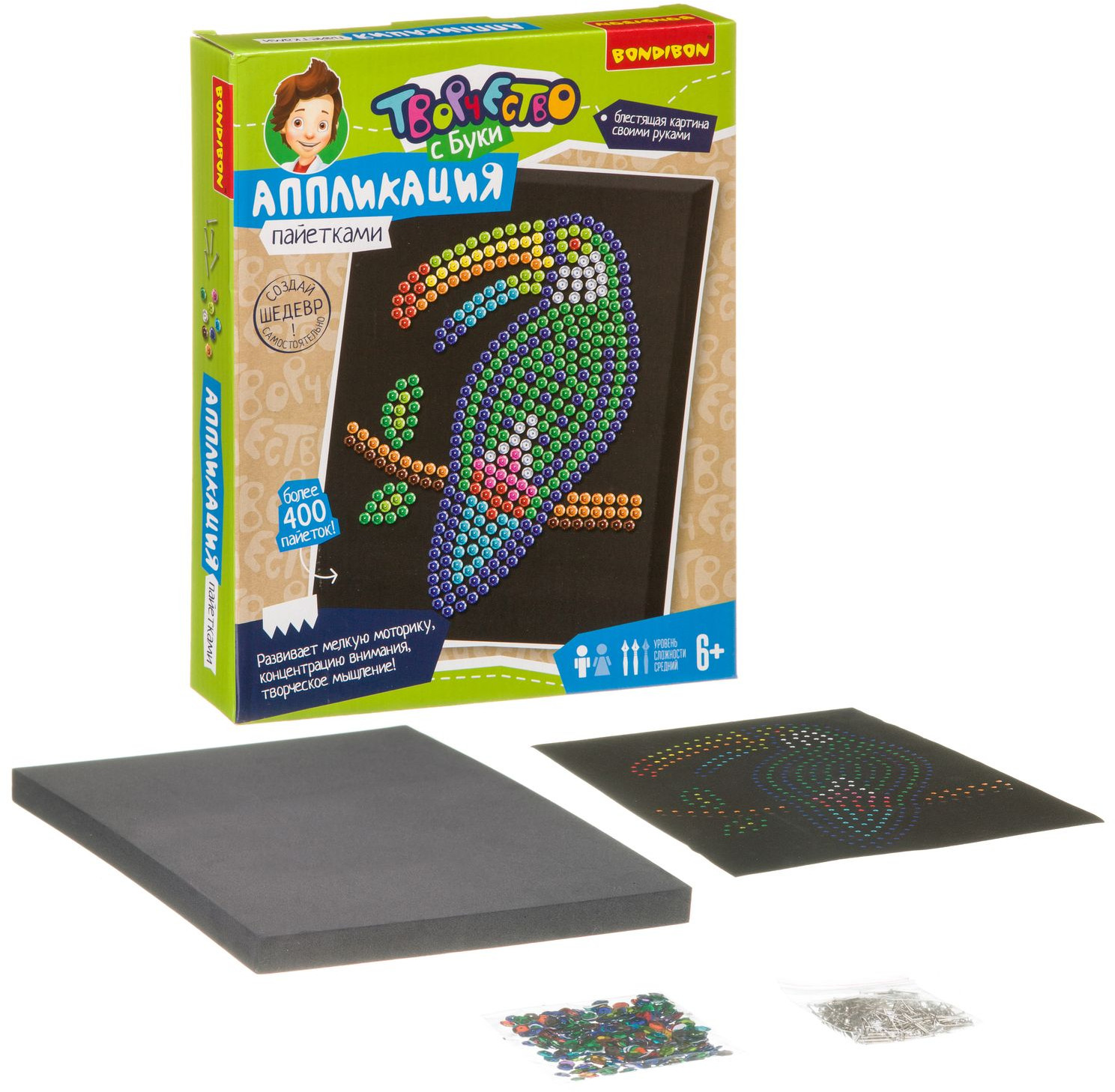 Bondibon Аппликация пайетками «Птица тукан»В данный момент этот товар отсутствует в продаже. Возможно, у нас найдется аналогичный или похожий товар здесь. Серия: Творчество с Луки Аппликация из пайеток — увлекательный и завораживающе красивый вид творчества. Работа с этим набором поможет развить мелкую моторику, концентрацию внимания и творческое мышление. По итогу Вы получите очень красивую картину с изображением сверкающей экзотической птицы тукан, а также море хорошего настроения и творческого вдохновения! |