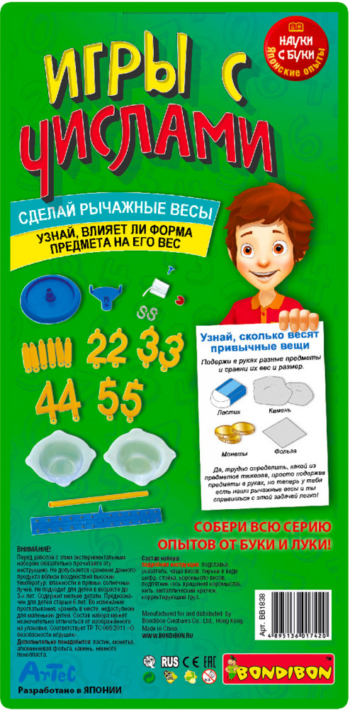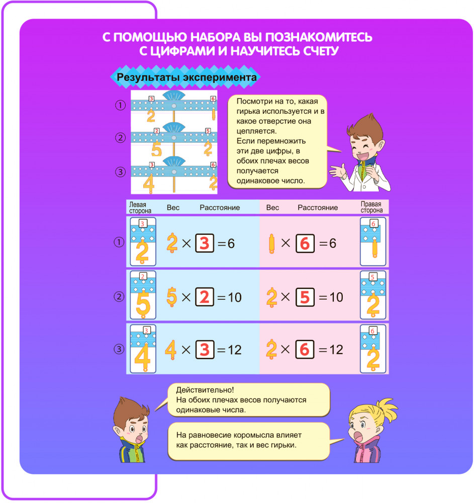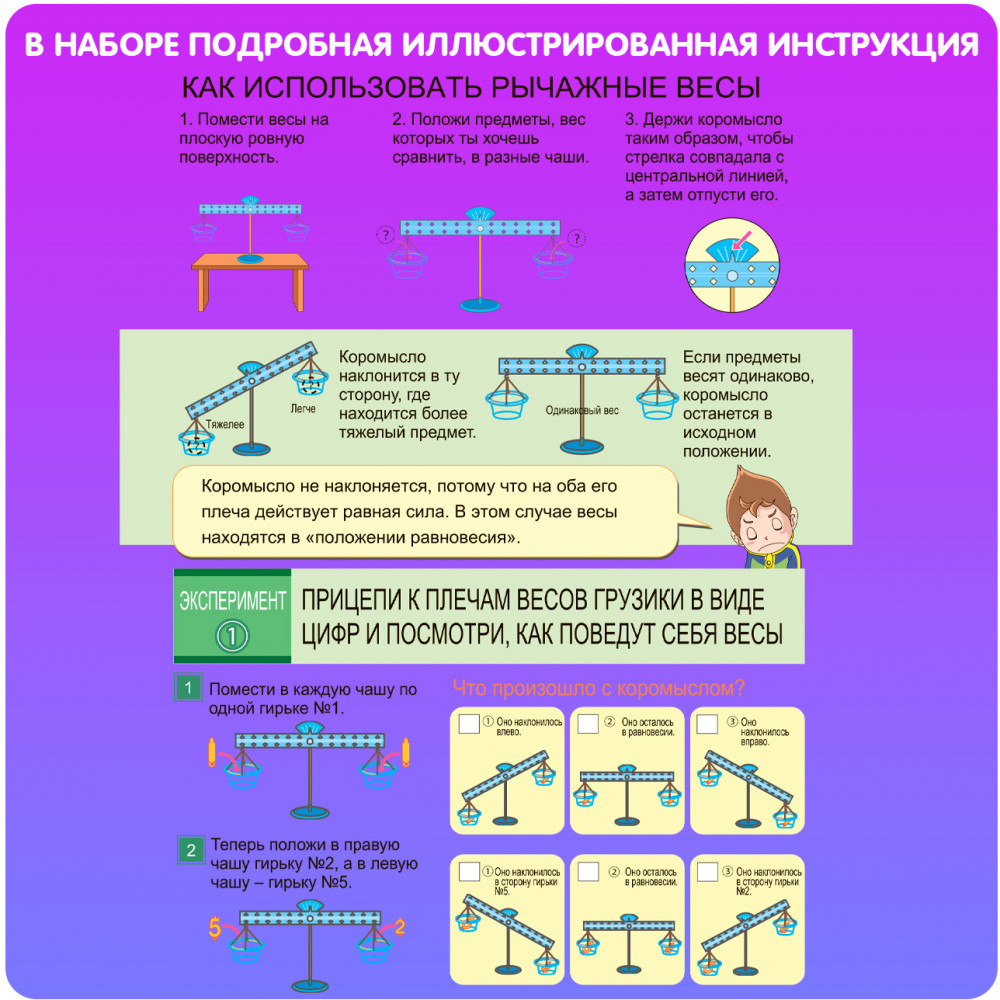 Набор «Игры с числами» расскажет и покажет, что же такое вес предметов, и сколько весят привычные вещи. Как использовать рычажные весы, и что это за прибор, влияет ли форма предмета на его вес, как уравновесить весы неравными грузами — эти и многие другие эксперименты можно произвести с помощью данного набора!