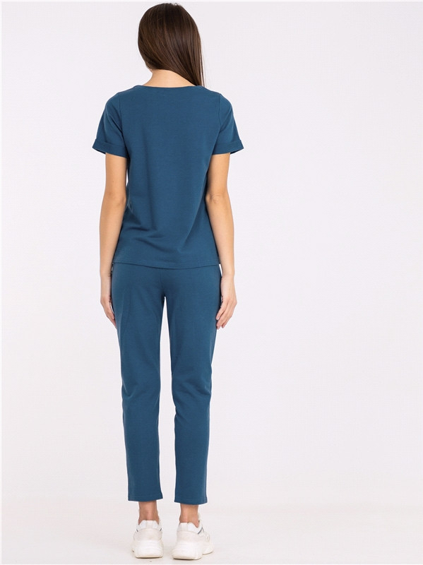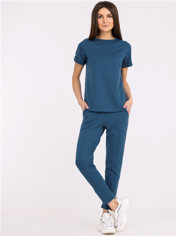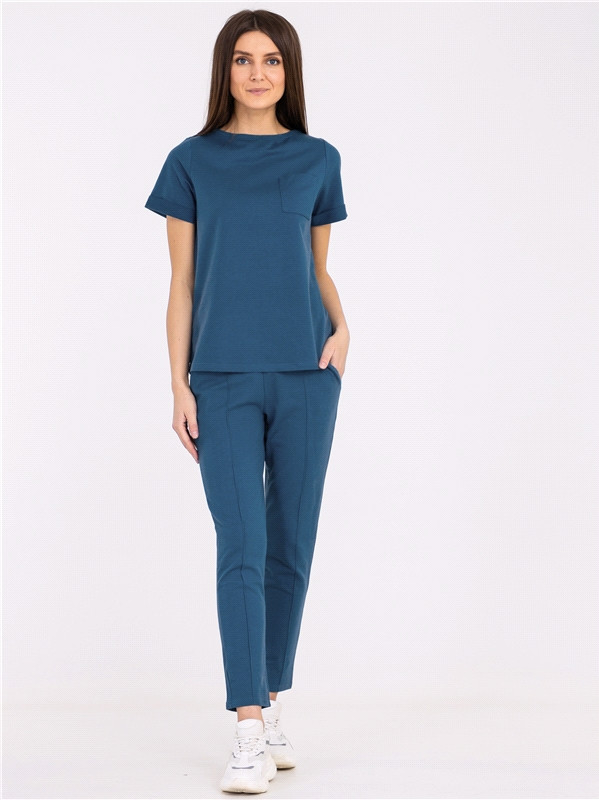 Сам костюм по себе качественно сшит, хорошая посадка. Не линяет, не растягивается. Цвет как на фото. Выглядишь в нем стильно. Стройнит. Но в тёплый день в нем очень жарко. В прохладный короткие рукава. Как-то несообразно погоде. Дома носить, если прохладно. Есть синтетика в составе. В жару хорошо так ощущается. Кто плохо переносит, лучше купить полностью хб.