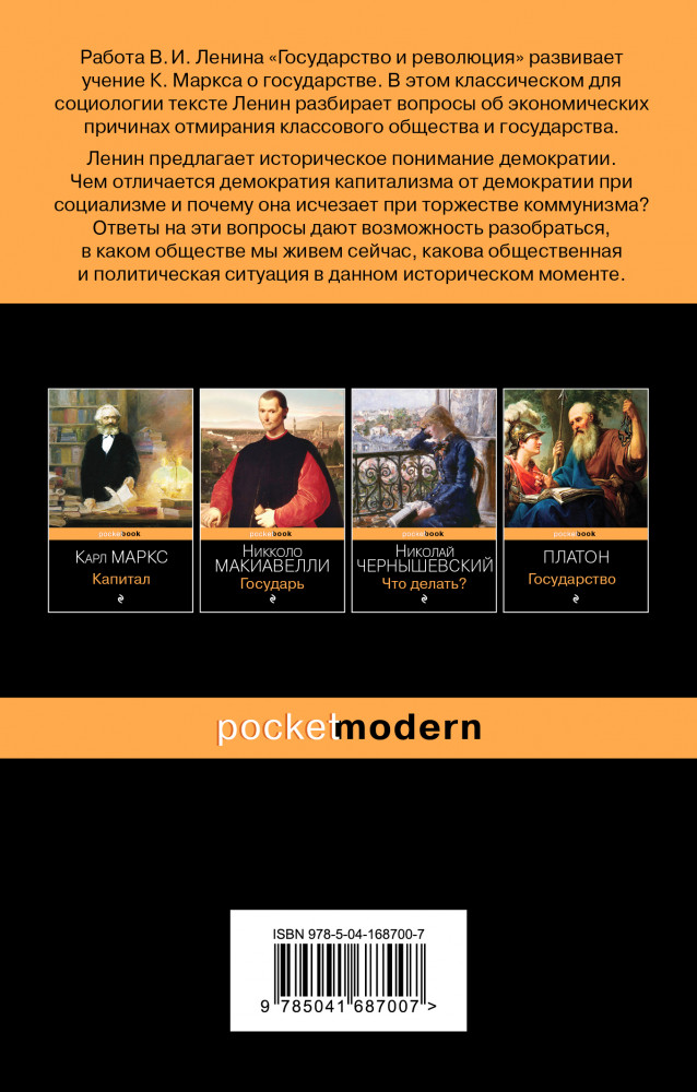 В данный момент этот товар отсутствует в продаже. Возможно, у нас найдется аналогичный или похожий товар здесь. Серия: Pocket Book (обложка) Работа В.И. Ленина «Государство и революция» развивает учение К. Маркса о государстве. В этом классическом для социологии тексте Ленин разбирает вопросы об экономических причинах отмирания классового общества и государства.
