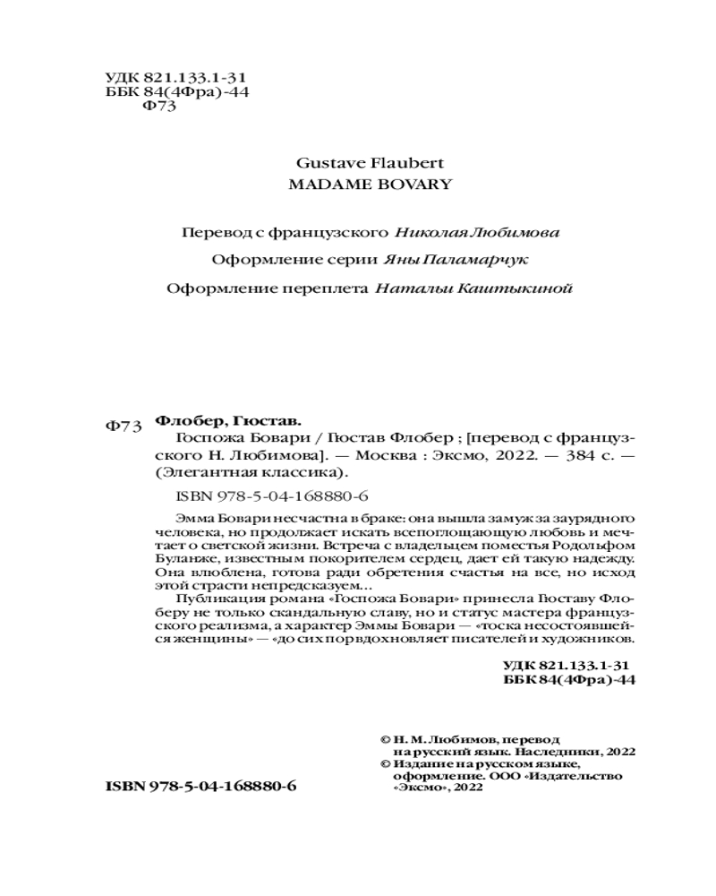 💳 Оплатить за товар можно при получении 🇰🇿 Есть бесплатная доставка по Казахстану от 1 дня 🎁 Копите бонусы с каждой покупки Серия: Элегантная классика Эмма Бовари несчастна в браке: она вышла замуж за заурядного человека, но продолжает искать всепоглощающую любовь и мечтает о светской жизни. Встреча с владельцем поместья Родольфом Буланже, известным покорителем сердец, дает ей такую надежду. Она влюблена, готова ради обретения счастья на все, но исход этой страсти непредсказуем... |