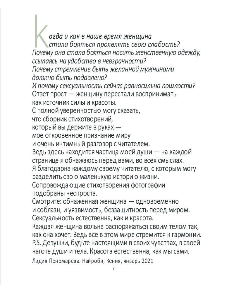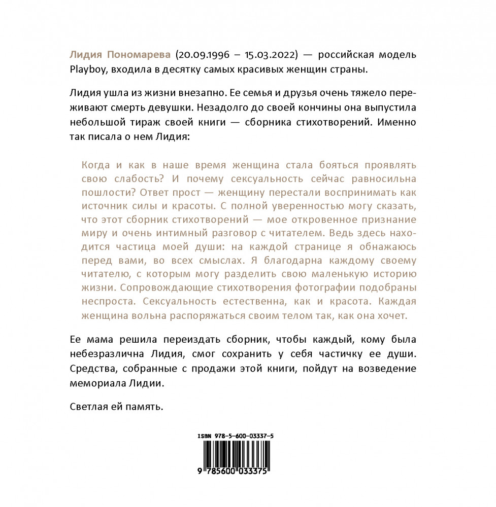 «Когда и как в наше время женщина стала бояться проявлять свою слабость? И почему сексуальность сейчас равносильна пошлости? Ответ прост — женщину перестали воспринимать как источник силы и красоты. С полной уверенностью могу сказать, что этот сборник стихотворений — мое откровенное признание миру и очень интимный разговор с читателем. Ведь здесь находится частица моей души: на каждой странице я обнажаюсь перед вами, во всех смыслах. Я благодарна каждому своему читателю, с которым могу разделить свою маленькую историю жизни. Сопровождающие стихотворения фотографии подобраны неспроста. Сексуальность естественна, как и красота. Каждая женщина вольна распоряжаться своим телом так, как она хочет».