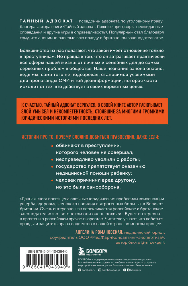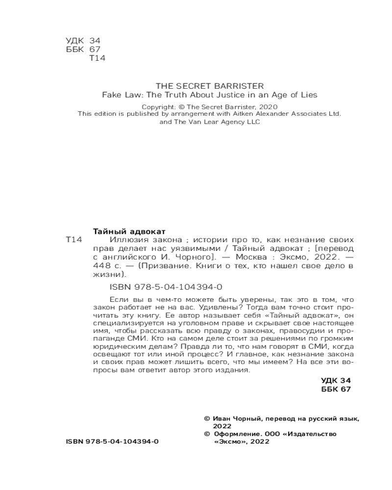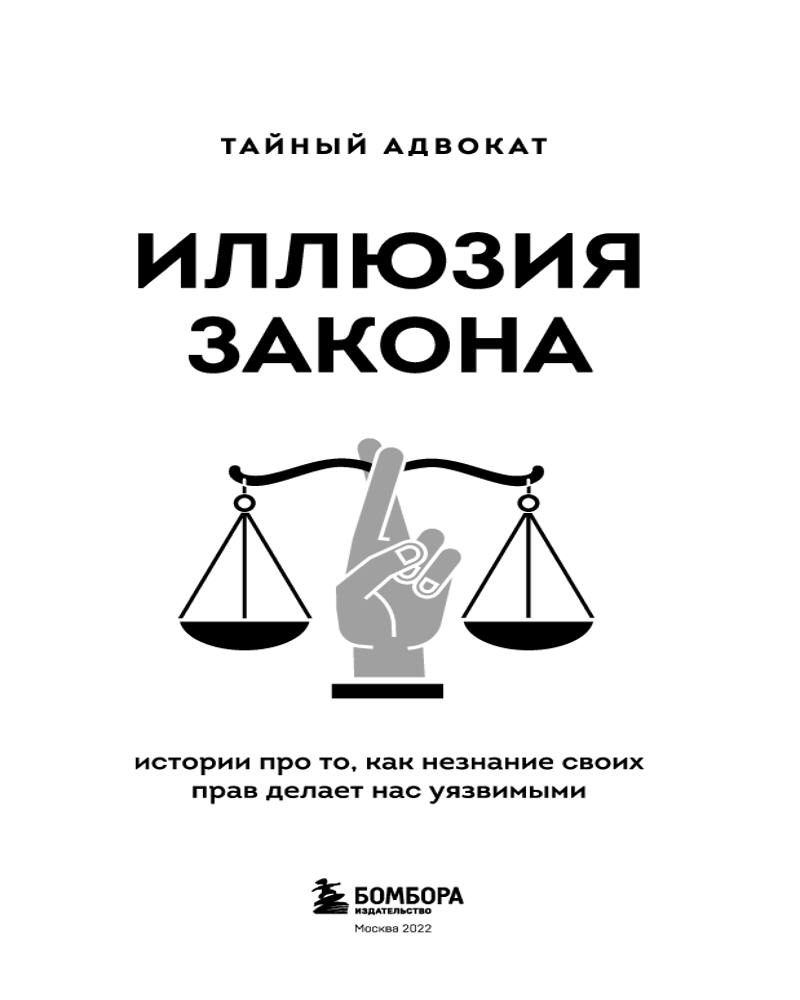 Иллюзия закона. Истории про то, как незнание своих прав делает нас уязвимымиВ данный момент этот товар отсутствует в продаже. Возможно, у нас найдется аналогичный или похожий товар здесь. Серия: Призвание. Книги о тех, кто нашел свое дело в жизни Если вы в чем-то можете быть уверены, так это в том, что закон работает не на вас. Удивлены? Тогда вам точно стоит прочитать эту книгу. Ее автор называет себя «Тайный адвокат», он специализируется на уголовном праве и скрывает свое настоящее имя, чтобы рассказать всю правду о законах, правосудии и пропаганде СМИ. Кто на самом деле стоит за решениями по громким юридическим делам? Правда ли то, что нам говорят в СМИ, когда освещают тот или иной процесс? И главное, как незнание закона и своих прав может лишить всего, что мы имеем? На все эти вопросы вам ответит автор этого издания. |