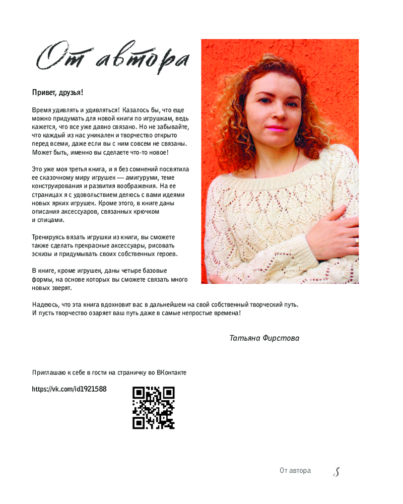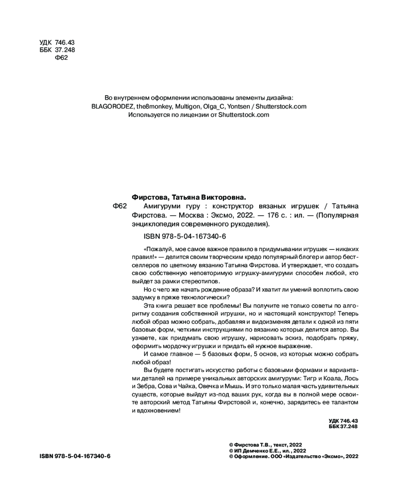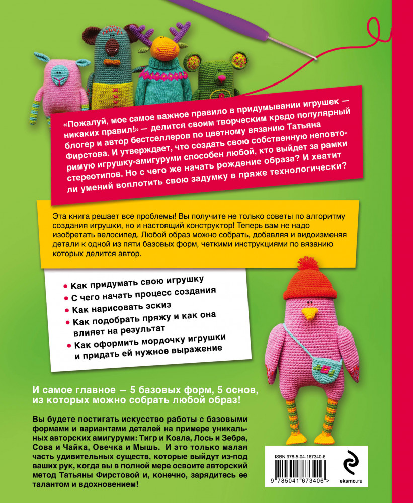 В данный момент этот товар отсутствует в продаже. Возможно, у нас найдется аналогичный или похожий товар здесь. Серия: Популярная энциклопедия современного рукоделия Новая книга автора бестселлера «Wow, нас всех связали!». И это не просто сборник мастер-классов по созданию удивительно харизматичных и ярких авторских амигуруми, а настоящий конструктор! Любой образ может родиться под вашими руками, стоит только освоить технологию вязания отдельных деталей и отделки игрушек. А этому вас научит автор книги, Татьяна Фирстова, и сделает это, как всегда, блестяще! Понятно, подробно, весело!