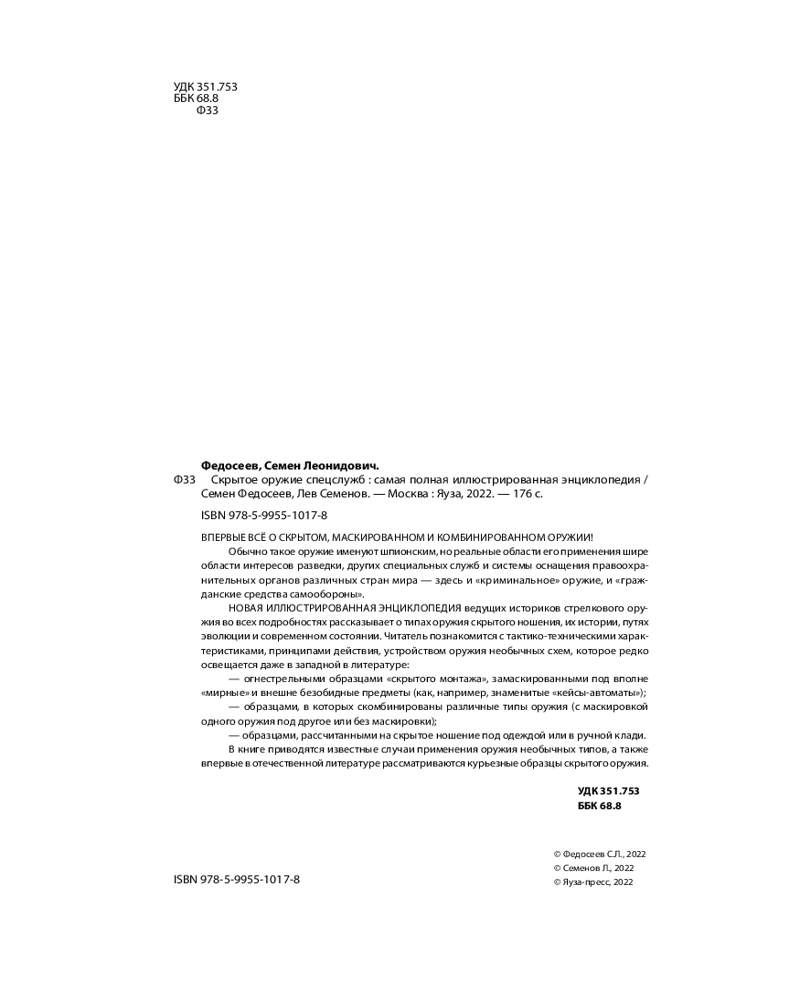 Скрытое оружие спецслужб. Самая полная иллюстрированная энциклопедияЛев Семенов, Семен Леонидович Федосеев В данный момент этот товар отсутствует в продаже. Возможно, у нас найдется аналогичный или похожий товар здесь. Серия: Большой военный справочник Впервые всё о скрытом, маскированном и комбинированном оружии! Обычно такое оружие именуют «шпионским», но реальные области его применения шире области интересов разведки, других специальных служб и системы оснащения правоохранительных органов различных стран мира — здесь и «криминальное» оружие, и «гражданские средства самообороны». |