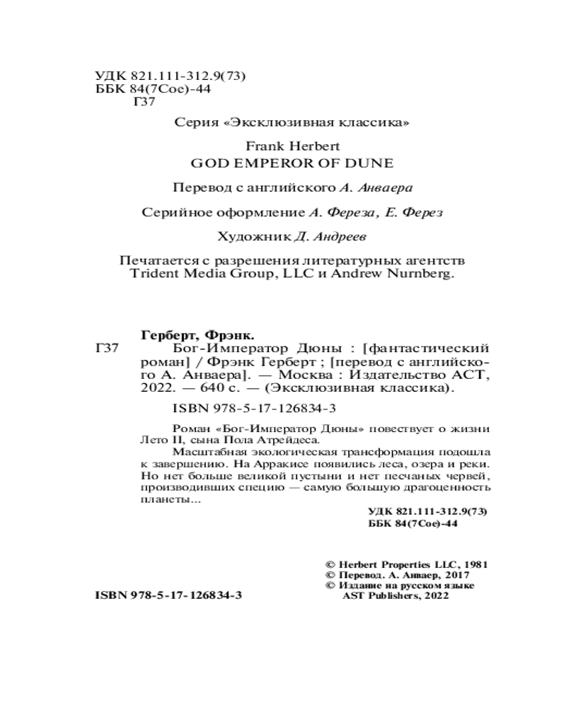 💳 Оплатить за товар можно при получении 🇰🇿 Есть бесплатная доставка по Казахстану от 1 дня 🎁 Копите бонусы с каждой покупки Серия: Эксклюзивная классика Четвёртая книга цикла «Хроники Дюны» — одного из самых культовых научно-фантастических циклов, завоевавших сердца миллионов читателей по всему миру. Суммарный тираж серии превышает 20 000 000 экземпляров. В ноябре 2023 года вторая часть крупнобюджетной экранизации «Дюны», вышедшей в 2021 году. Не ждите продолжения фильма, читайте уже сейчас! |