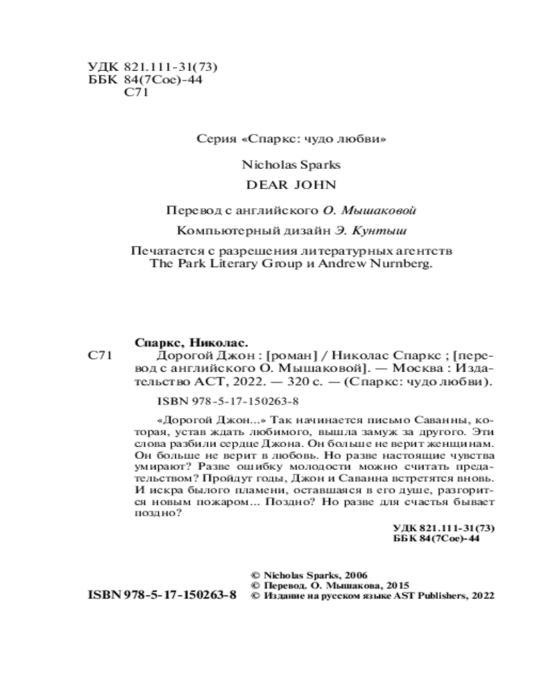 💳 Оплатить за товар можно при получении 🇰🇿 Есть бесплатная доставка по Казахстану от 1 дня 🎁 Копите бонусы с каждой покупки Серия: Спаркс: чудо любви (м) «Дорогой Джон...» Так начинается письмо Саванны, которая, устав ждать любимого, вышла замуж за другого. Эти слова разбили сердце Джона. Он больше не верит женщинам. Он больше не верит в любовь. Но разве настоящие чувства умирают? Разве ошибку молодости можно считать предательством? Пройдут годы, Джон и Саванна встретятся вновь. И искра былого пламени, оставшаяся в его душе, разгорится новым пожаром... Поздно? Но разве для счастья бывает поздно? |