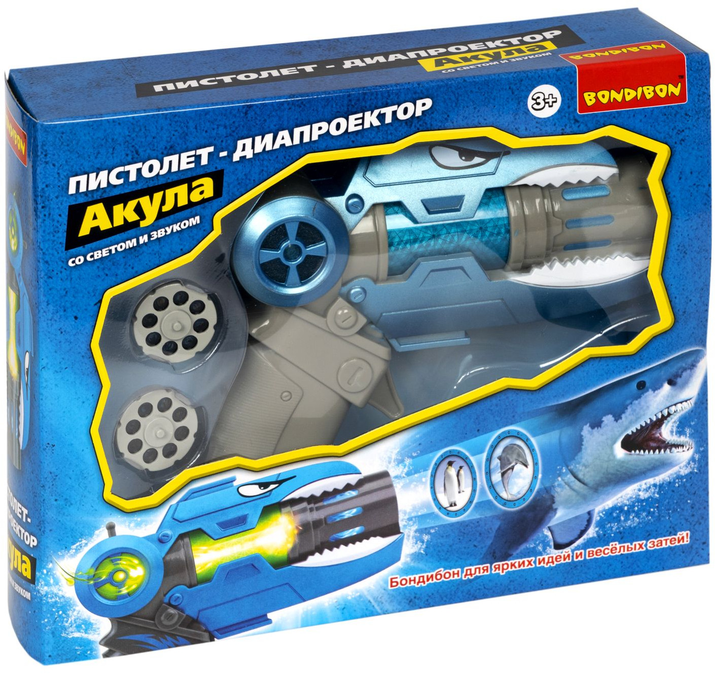 Bondibon Пистолет-диапроектор «Акула»В данный момент этот товар отсутствует в продаже. Возможно, у нас найдется аналогичный или похожий товар здесь. Выберите и установите в пистолет диск для просмотра, нажмите на курок. Перемещайте диск для просмотра новых слайдов. В комплекте 2 диска. Пистолет со звуком и светящийся, без дисков может выполнять функцию фонарика |