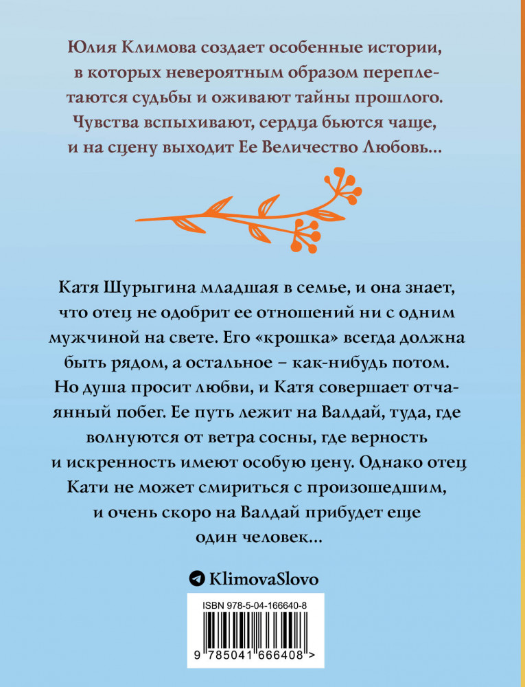 Катя Шурыгина младшая в семье, и она знает, что отец не одобрит ее отношений ни с одним мужчиной на свете. Его «крошка» всегда должна быть рядом, а остальное — как-нибудь потом. Но душа просит любви, и Катя совершает отчаянный побег. Ее путь лежит на Валдай, туда, где волнуются от ветра сосны, где верность и искренность имеют особую цену. Однако отец Кати не может смириться с произошедшим, и очень скоро на Валдай прибудет еще один человек... |