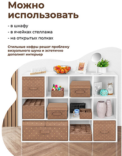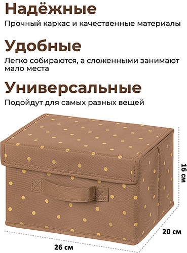 El Casa Короб для храненияВ данный момент этот товар отсутствует в продаже. Возможно, у нас найдется аналогичный или похожий товар здесь. Серия: Шоколадный горошек Короб складной с крышкой поможет организовать хранение в самых разных помещениях: в прихожей, гостиной, спальне, детской и любых других комнатах. Такие кофры эстетично выглядят. Их можно разместить не только в шкафу, но и на открытых полках. Помогут организовать систему хранения самых разных вещей в едином стиле, будь то игрушки, одежда, канцелярия, косметика, нижнее белье, носки, рукоделие или другие мелочи. Органайзер выполнен из нетканого материала и имеет плотные картонные вставки. Имеет ручки, чтобы коробку было удобно переносить и выдвигать как ящик. Такой контейнер станет удобным дополнением дома и поможет эффективно использовать каждый сантиметр пространства. |
