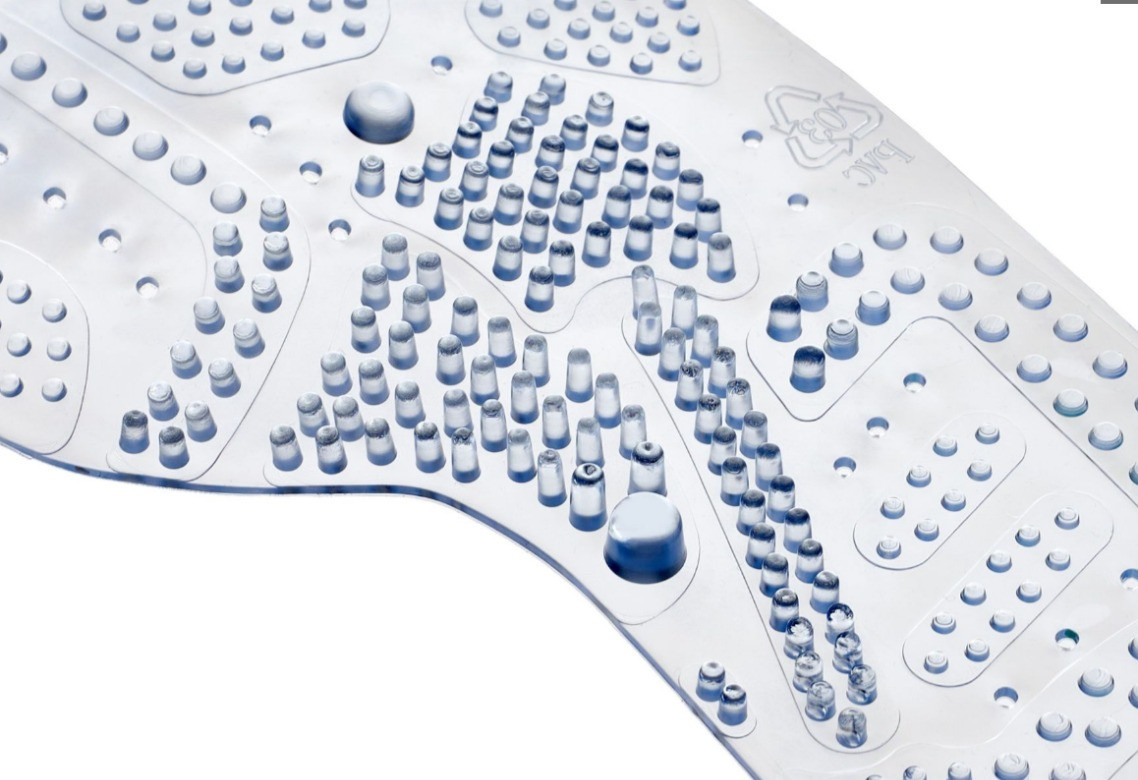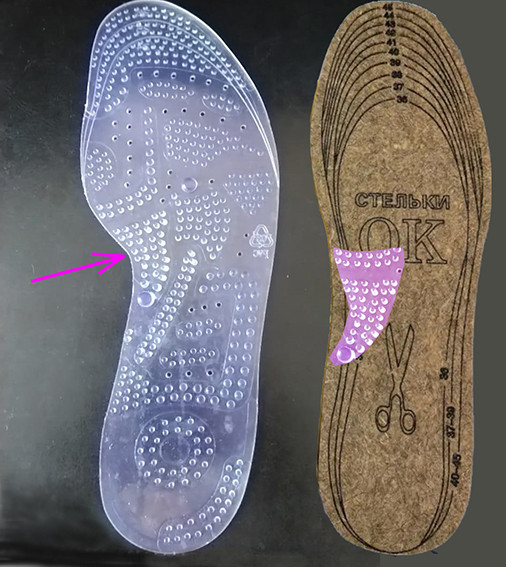 Здравствуйте. Идея хорошая. Только шаблон стелек был снят с особенной ступни, поэтому неудобен. Это видно на приложенном фото. Пятки стелек из тапок смещаются во внутреннюю сторону. Усиленные шипы должны быть в середине подъема стопы, а не в ее начале. Поэтому создаются болезненные ощущения. А если обрезать под меньший размер, то этот жесткий бугорок переместится еще ближе к большому пальцу.