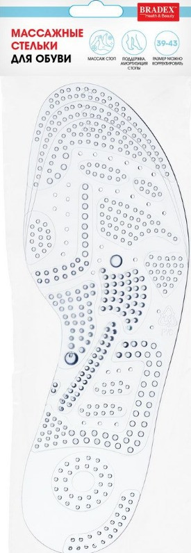 Bradex Стельки массажныеВ данный момент этот товар отсутствует в продаже. Возможно, у нас найдется аналогичный или похожий товар здесь. Массажные стельки для обуви — силиконовые ортопедические стельки со специальной формой для поддержки и амортизации стопы при ходьбе. Изделия позволяют облегчить дискомфорт в ногах, вызванный длительной стоячей работой, утомляемостью при избыточном весе, плоскостопии. Рекомендовано для профилактики остеохондроза, артроза, пяточной шпоры. Регулярное использование изделия позволяет улучшить циркуляцию крови, повышает тонус и снимает напряжение в мышцах. Размер стелек для обуви можно индивидуально скорректировать, подрезав край до нужной величины. Массажные стельки просты в уходе: достаточно регулярно обрабатывать их мыльном растворе. |