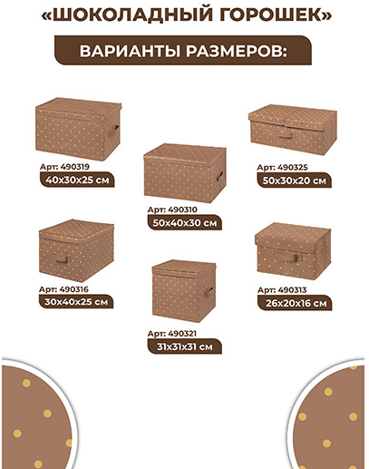 El Casa Короб для храненияВ данный момент этот товар отсутствует в продаже. Возможно, у нас найдется аналогичный или похожий товар здесь. Серия: Шоколадный горошек Короб складной с крышкой поможет организовать хранение в самых разных помещениях: в прихожей, гостиной, спальне, детской и любых других комнатах. Такие кофры эстетично выглядят. Их можно разместить не только в шкафу, но и на открытых полках. Помогут организовать систему хранения самых разных вещей в едином стиле, будь то игрушки, одежда, канцелярия, косметика, нижнее белье, носки, рукоделие или другие мелочи. Органайзер выполнен из нетканого материала и имеет плотные картонные вставки. Имеет ручки, чтобы коробку было удобно переносить и выдвигать как ящик. Такой контейнер станет удобным дополнением дома и поможет эффективно использовать каждый сантиметр пространства. |