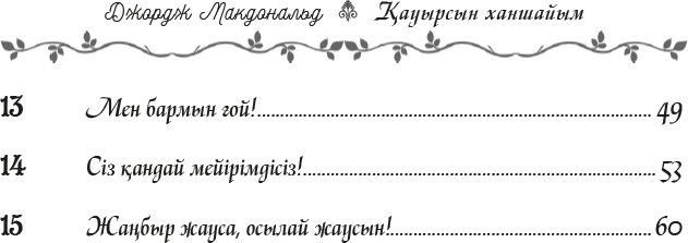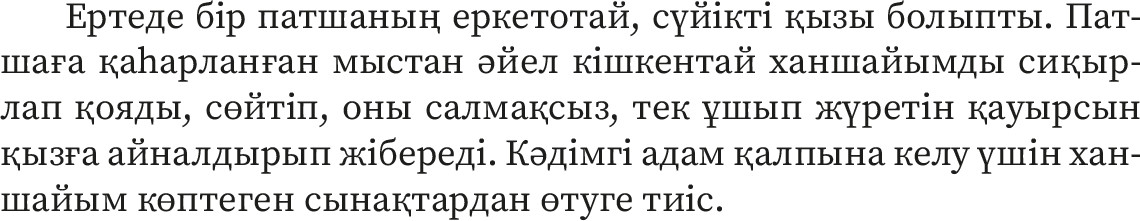 В данный момент этот товар отсутствует в продаже. Возможно, у нас найдется аналогичный или похожий товар здесь. Ертеде бір патшаның еркетотай, сүйікті қызы болыпты. Патшаға қаһарланған мыстан әйел кішкентай ханшайымды сиқырлап қояды, сөйтіп оны салмақсыз, тек ұшып жүретін қауырсын қызға айналдырып жібереді. Кәдімгі адам қалпына келу үшін ханшайым көптеген сынақтардан өтуі тиіс. |