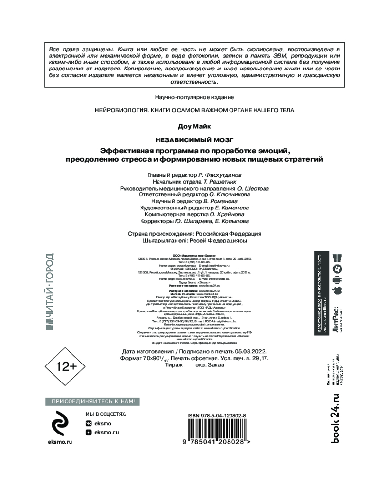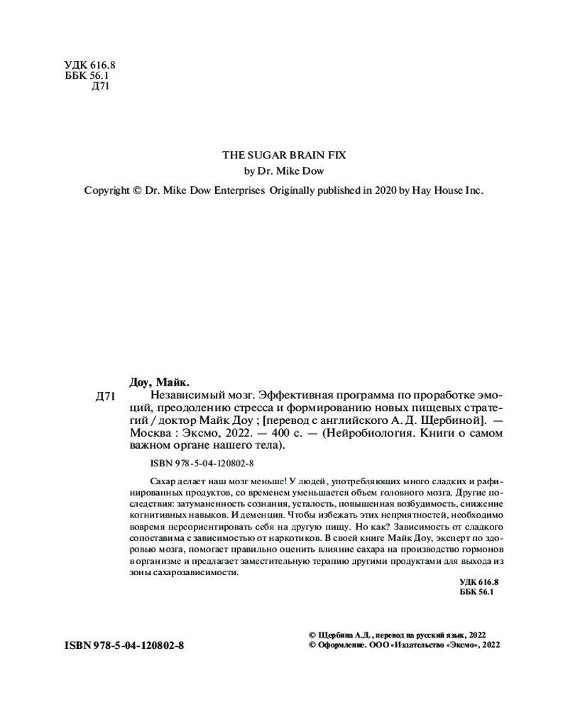 Независимый мозг. Эффективная программа по проработке эмоций, преодолению стрессаВ данный момент этот товар отсутствует в продаже. Возможно, у нас найдется аналогичный или похожий товар здесь. Серия: Нейробиология. Книги о самом важном органе нашего тела Знаете ли вы, что в медицинской среде существует термин «засахаренный мозг»? Да-да, он меньше по объему, у него хуже проводимость сигнальных путей, а еще он значительно менее функционален. |